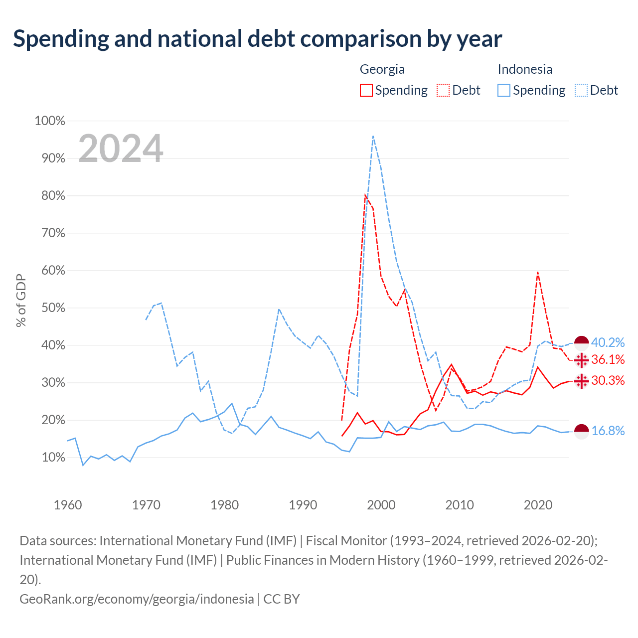 Georgia has $12.3B in government debt (36.1% of GDP), compared to $561B (40.2% of GDP) in Indonesia.