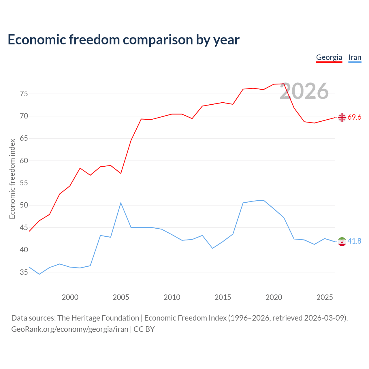 The Economic Freedom Index for Georgia is 69.6, ranking 41/197, compared to 41.8 for Iran, ranking 185/197. The chart above displays a comparison of annual changes in economic freedom indexes.