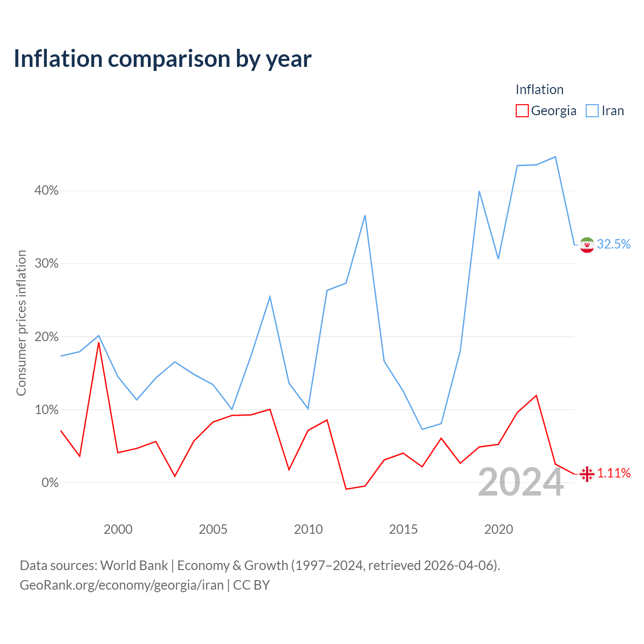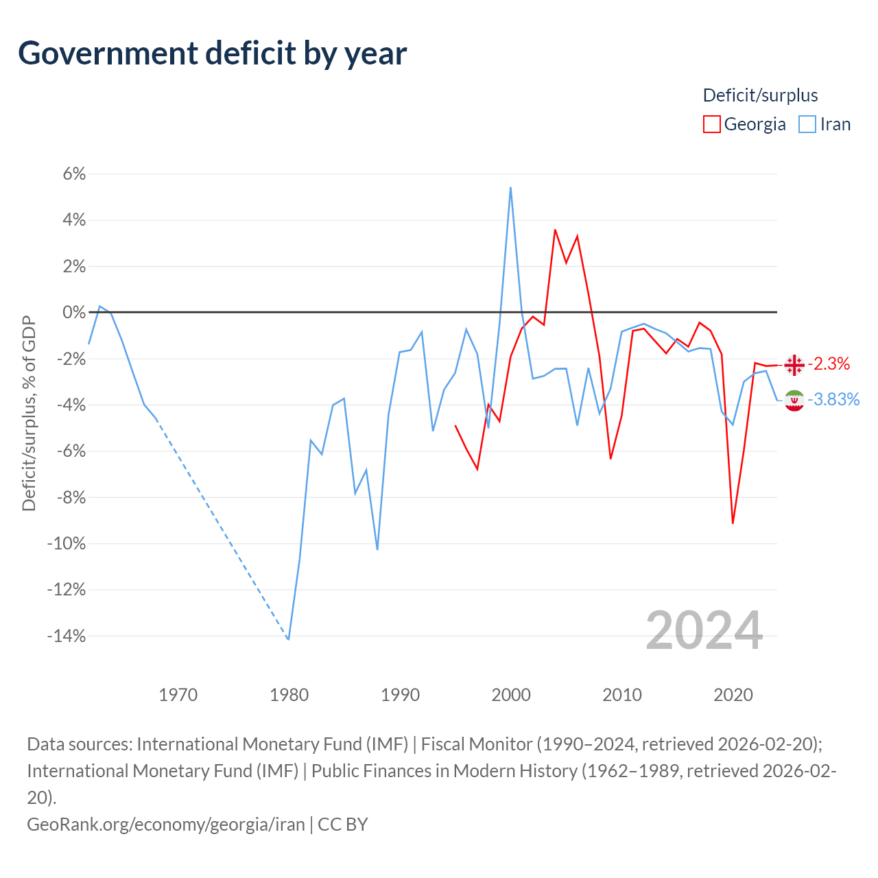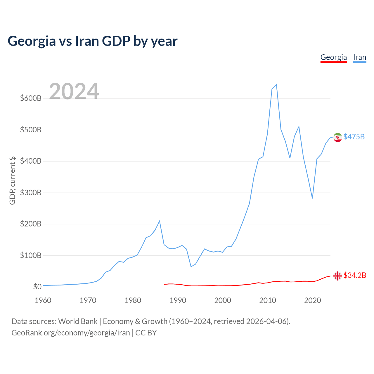 Georgia has a GDP of $34.2B compared to $475B for Iran, ranking 107/197 and 34/197 by economy size, respectively.