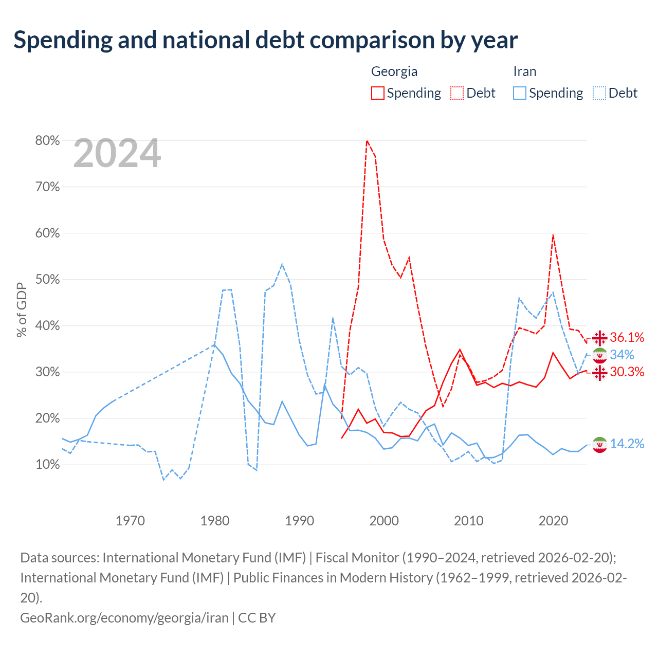 Georgia has $12.3B in government debt (36.1% of GDP), compared to $162B (34% of GDP) in Iran.