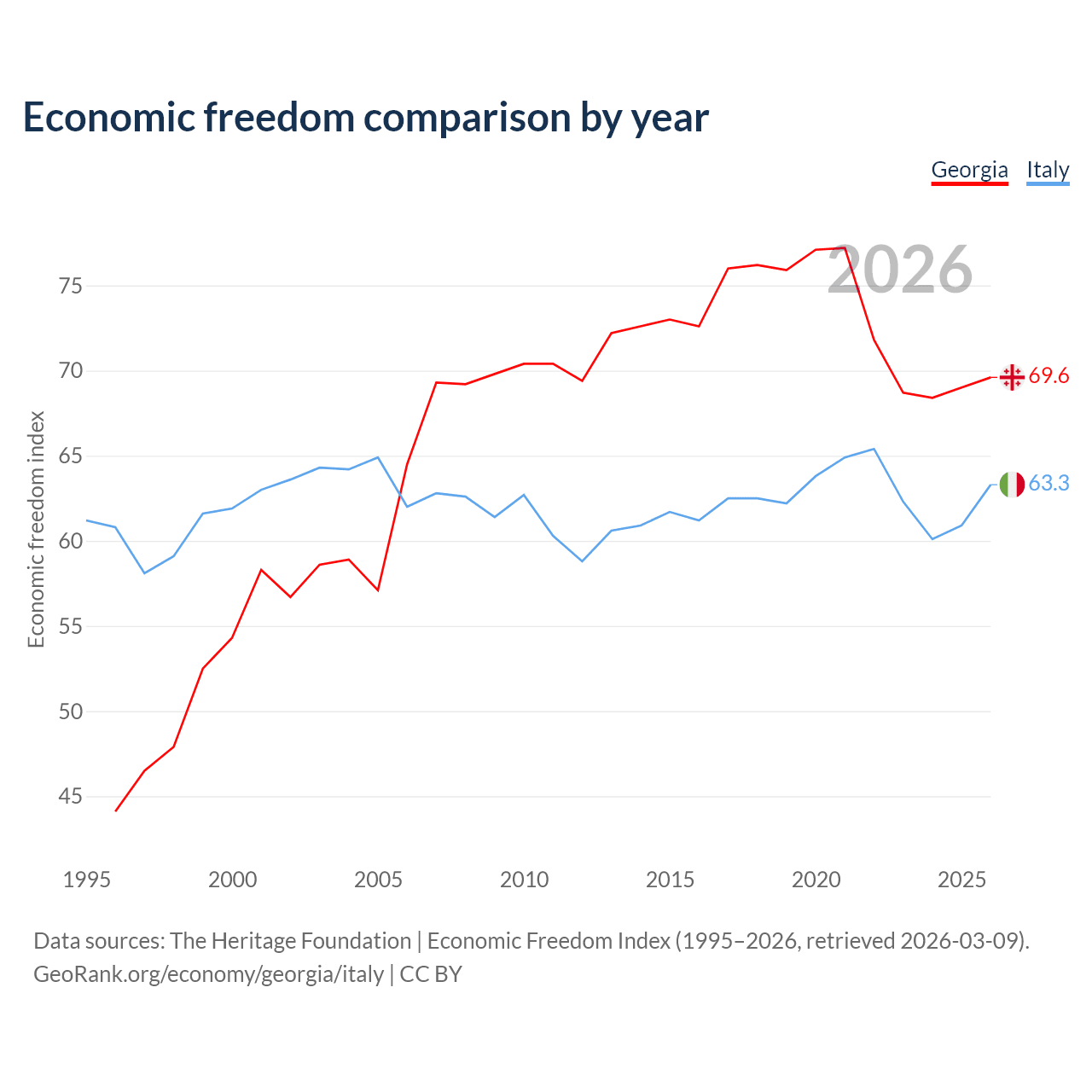 The Economic Freedom Index for Georgia is 69.6, ranking 41/197, compared to 63.3 for Italy, ranking 80/197. The chart above displays a comparison of annual changes in economic freedom indexes.