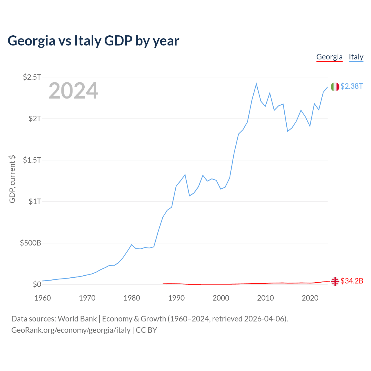 Georgia has a GDP of $34.2B compared to $2.38T for Italy, ranking 107/197 and 8/197 by economy size, respectively.