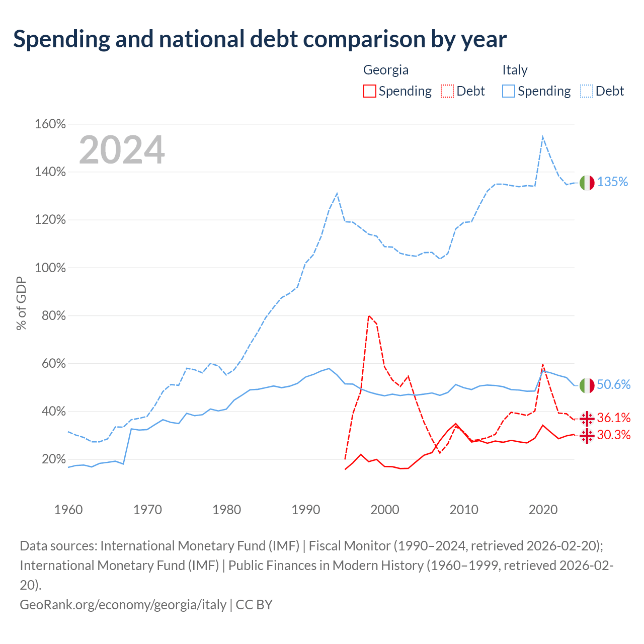 Georgia has $12.3B in government debt (36.1% of GDP), compared to $3.22T (135.3% of GDP) in Italy.