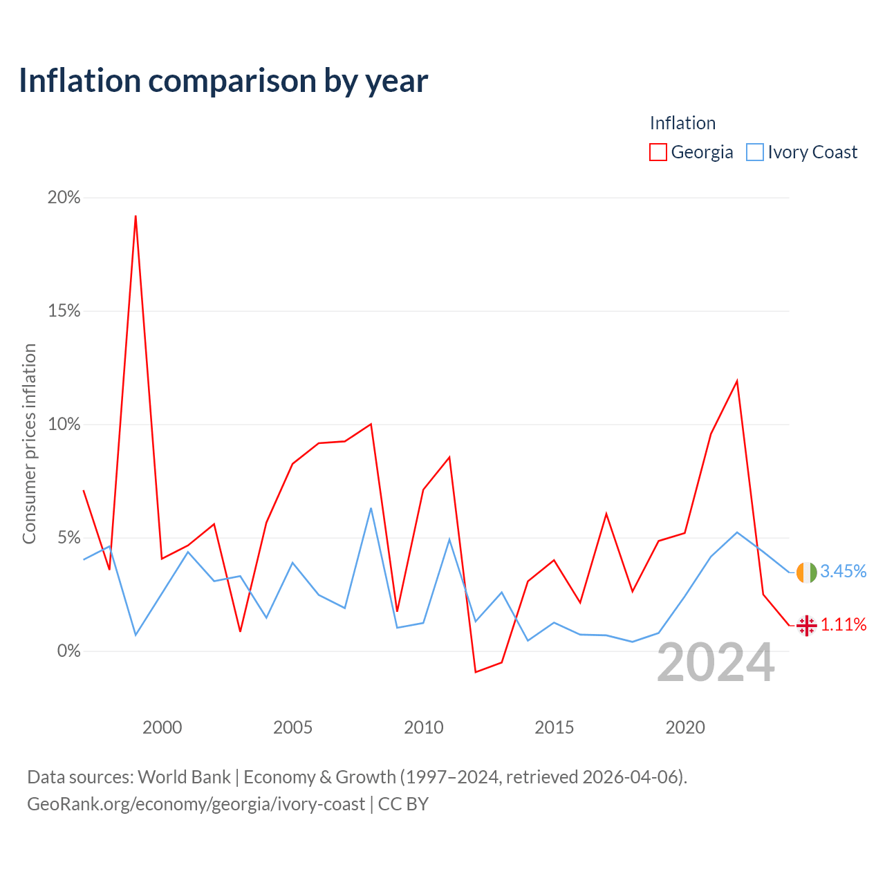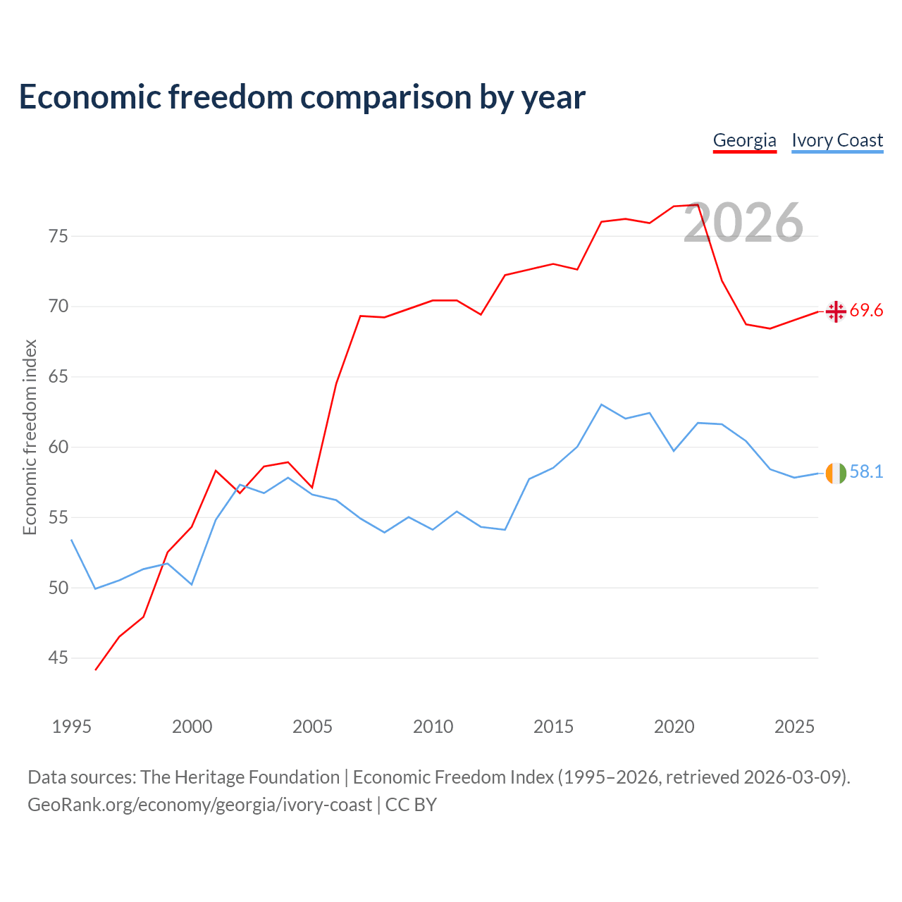 The Economic Freedom Index for Georgia is 69.6, ranking 41/197, compared to 58.1 for Ivory Coast, ranking 111/197. The chart above displays a comparison of annual changes in economic freedom indexes.