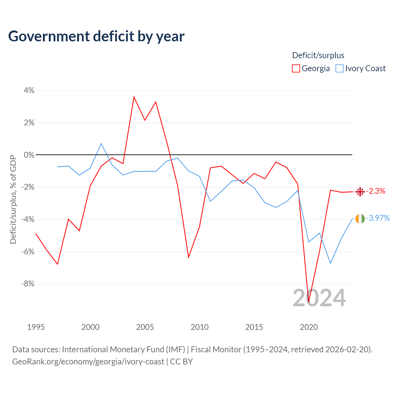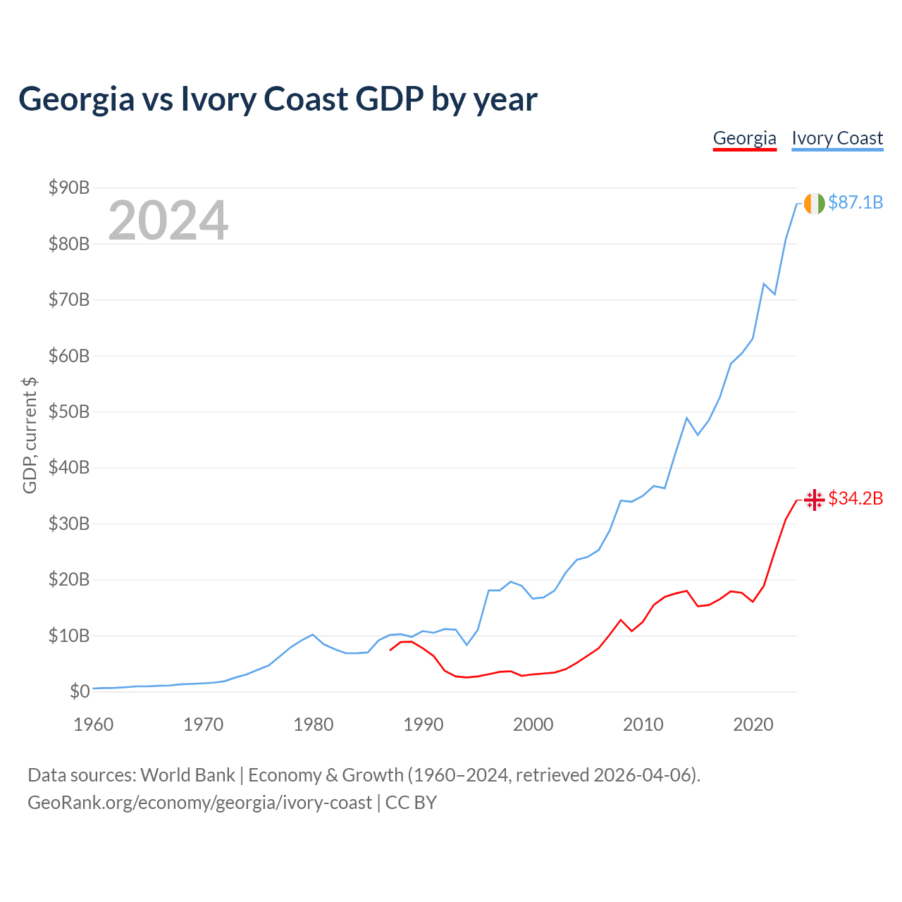 Georgia has a GDP of $34.2B compared to $87.1B for Ivory Coast, ranking 107/197 and 77/197 by economy size, respectively.
