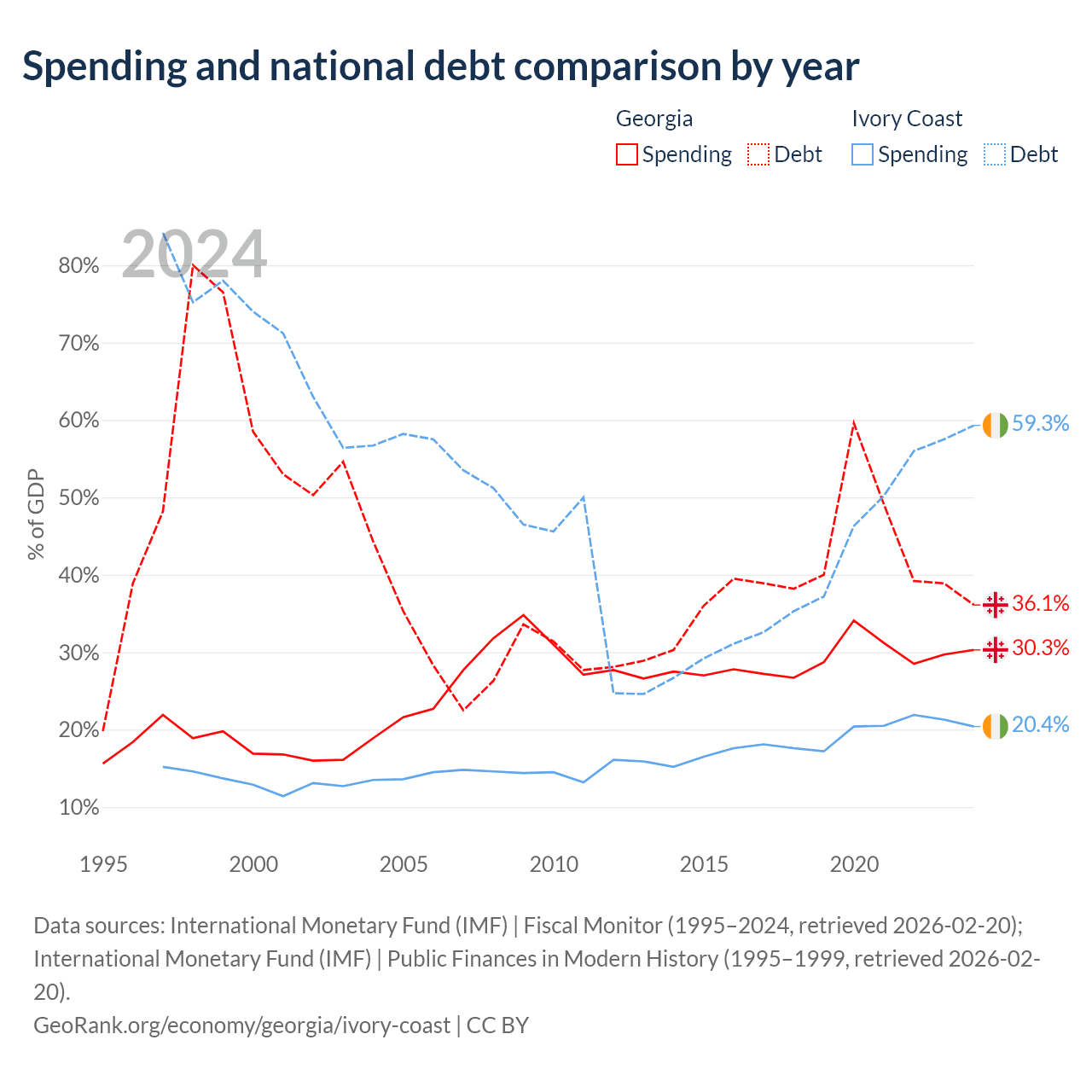 Georgia has $12.3B in government debt (36.1% of GDP), compared to $51.6B (59.3% of GDP) in Ivory Coast.