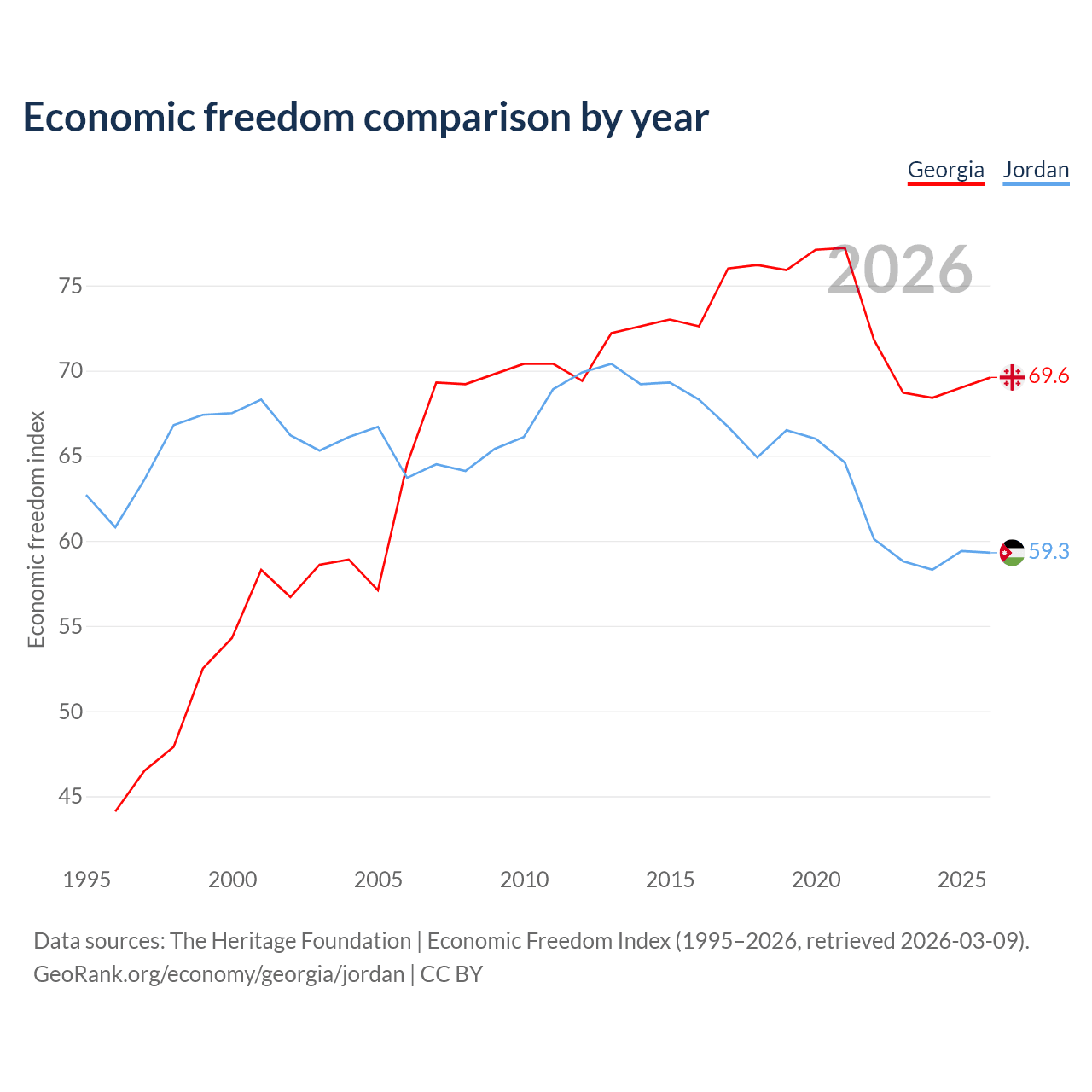 The Economic Freedom Index for Georgia is 69.6, ranking 41/197, compared to 59.3 for Jordan, ranking 104/197. The chart above displays a comparison of annual changes in economic freedom indexes.