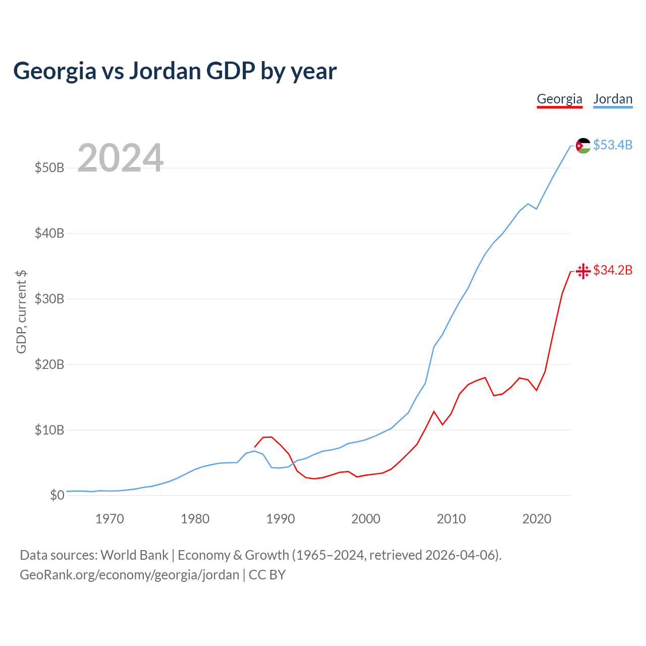 Georgia has a GDP of $34.2B compared to $53.4B for Jordan, ranking 107/197 and 90/197 by economy size, respectively.