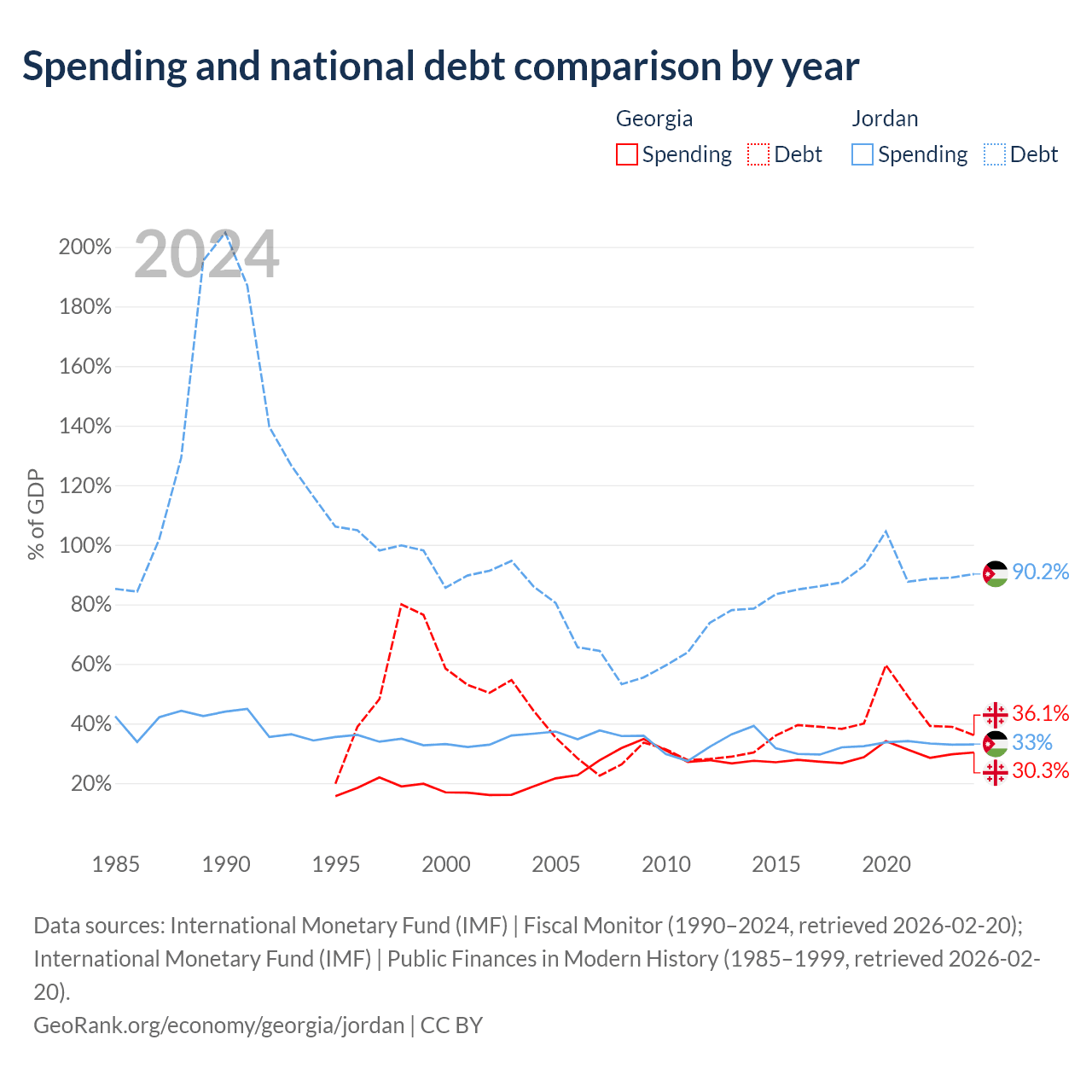 Georgia has $12.3B in government debt (36.1% of GDP), compared to $48.1B (90.2% of GDP) in Jordan.