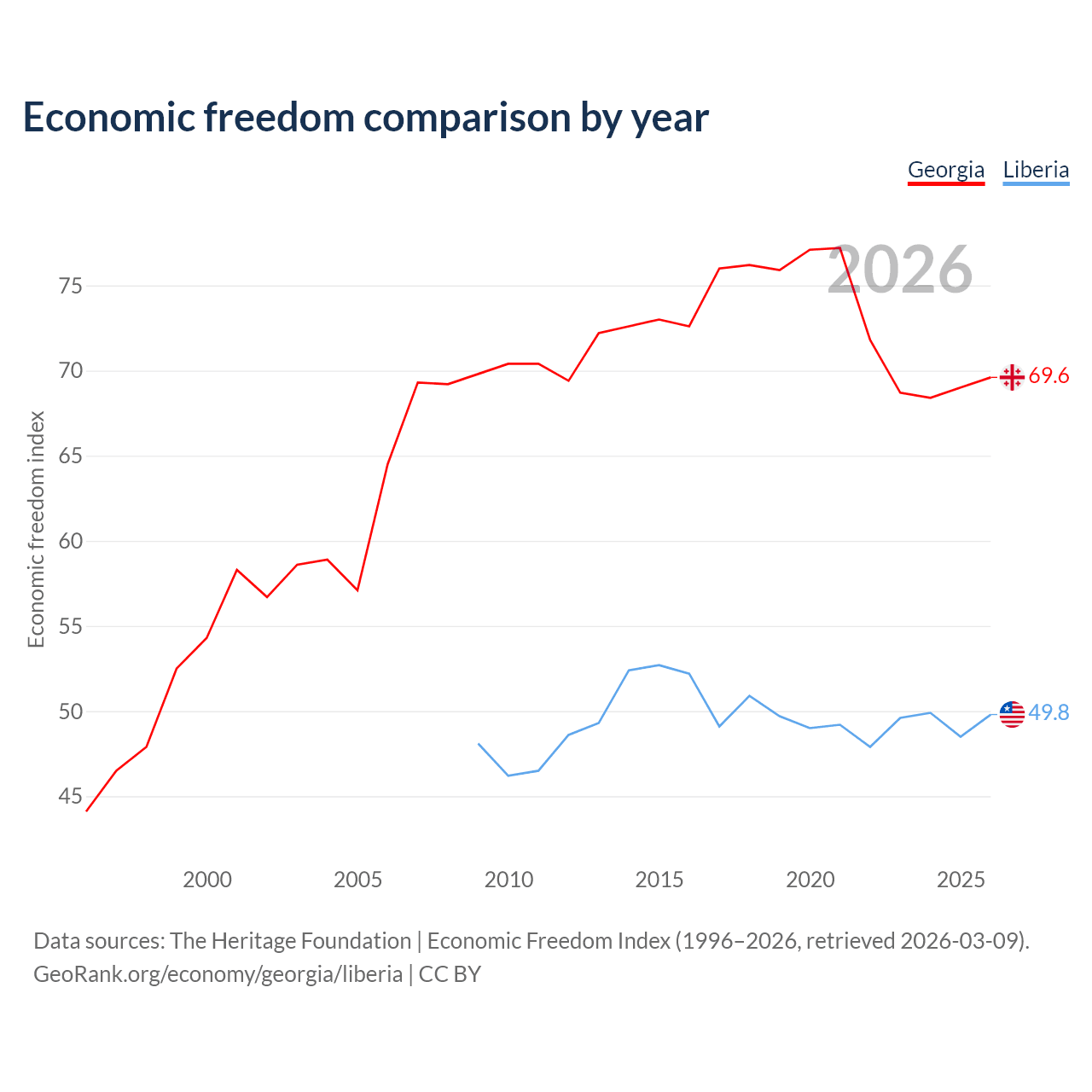 The Economic Freedom Index for Georgia is 69.6, ranking 41/197, compared to 49.8 for Liberia, ranking 163/197. The chart above displays a comparison of annual changes in economic freedom indexes.