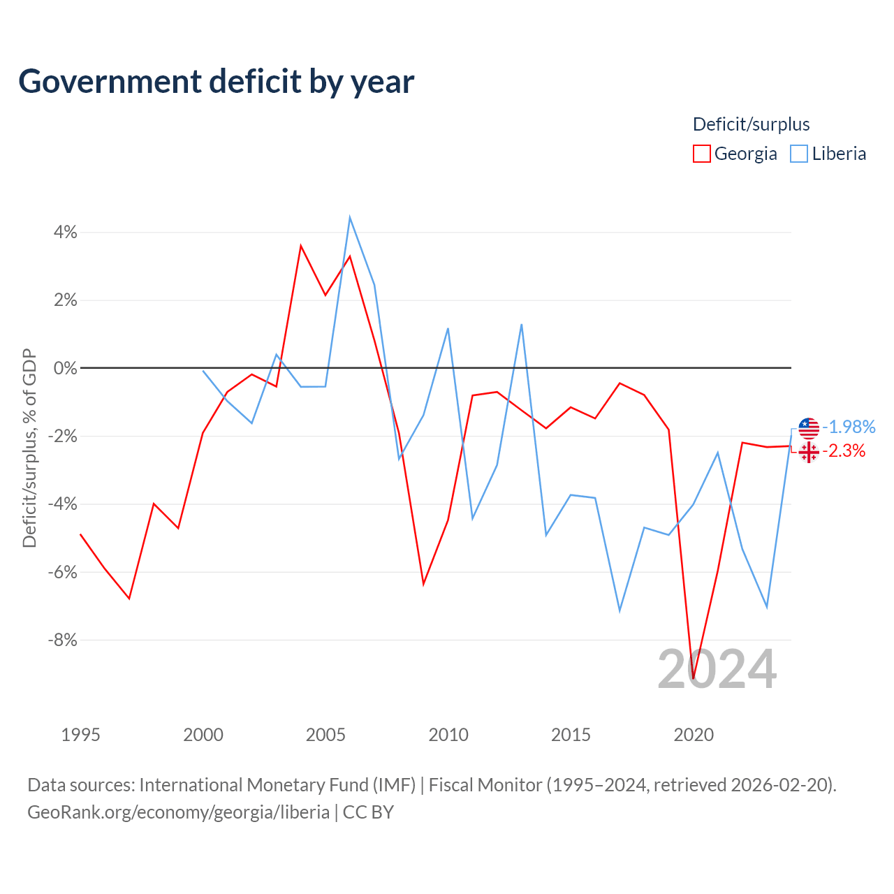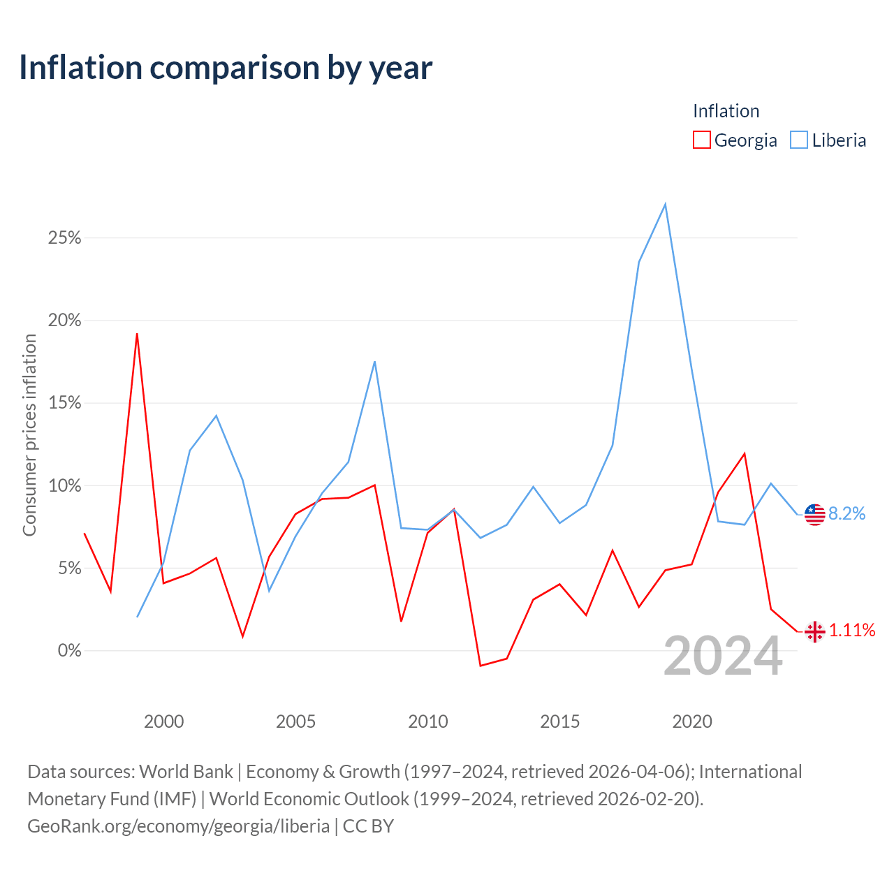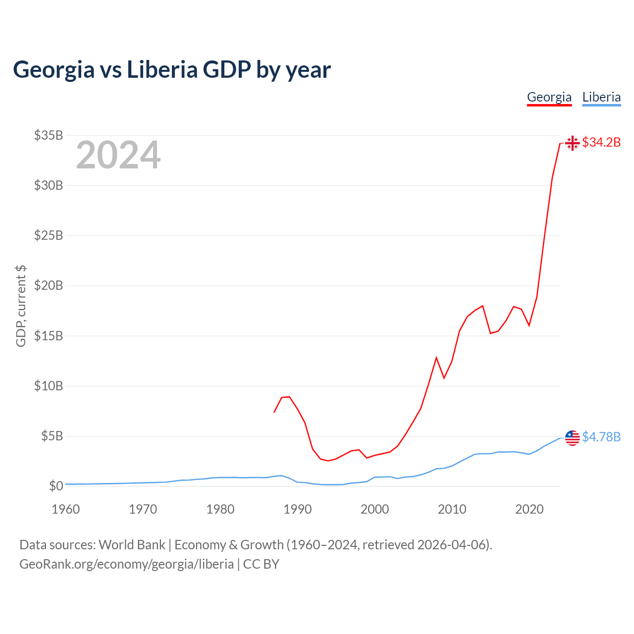 Georgia has a GDP of $34.2B compared to $4.78B for Liberia, ranking 107/197 and 163/197 by economy size, respectively.