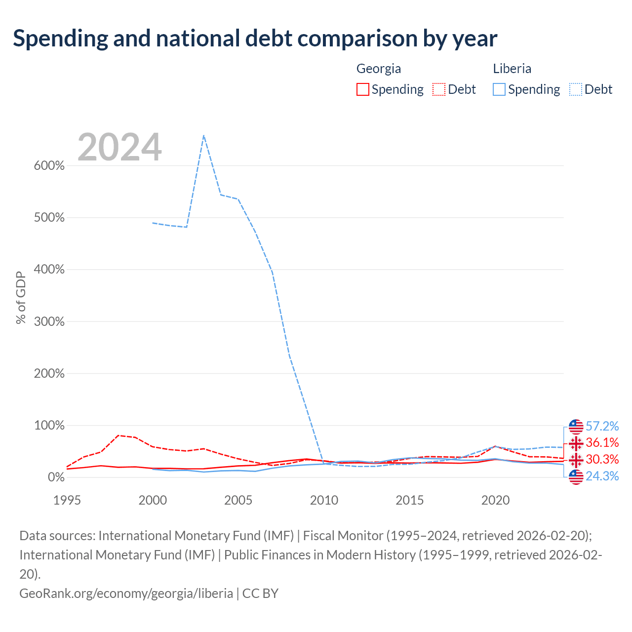 Georgia has $12.3B in government debt (36.1% of GDP), compared to $2.73B (57.2% of GDP) in Liberia.