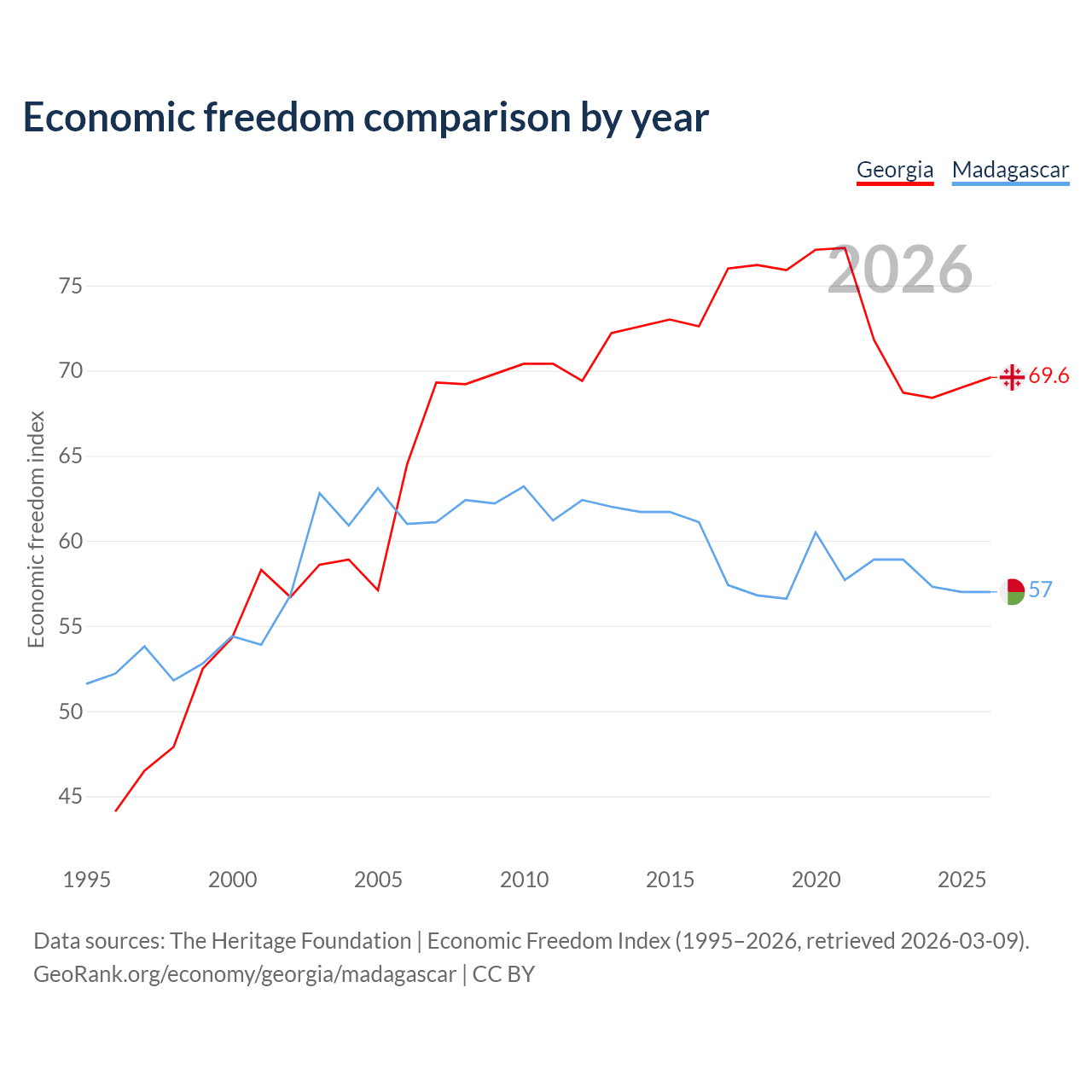 The Economic Freedom Index for Georgia is 69.6, ranking 41/197, compared to 57 for Madagascar, ranking 119/197. The chart above displays a comparison of annual changes in economic freedom indexes.