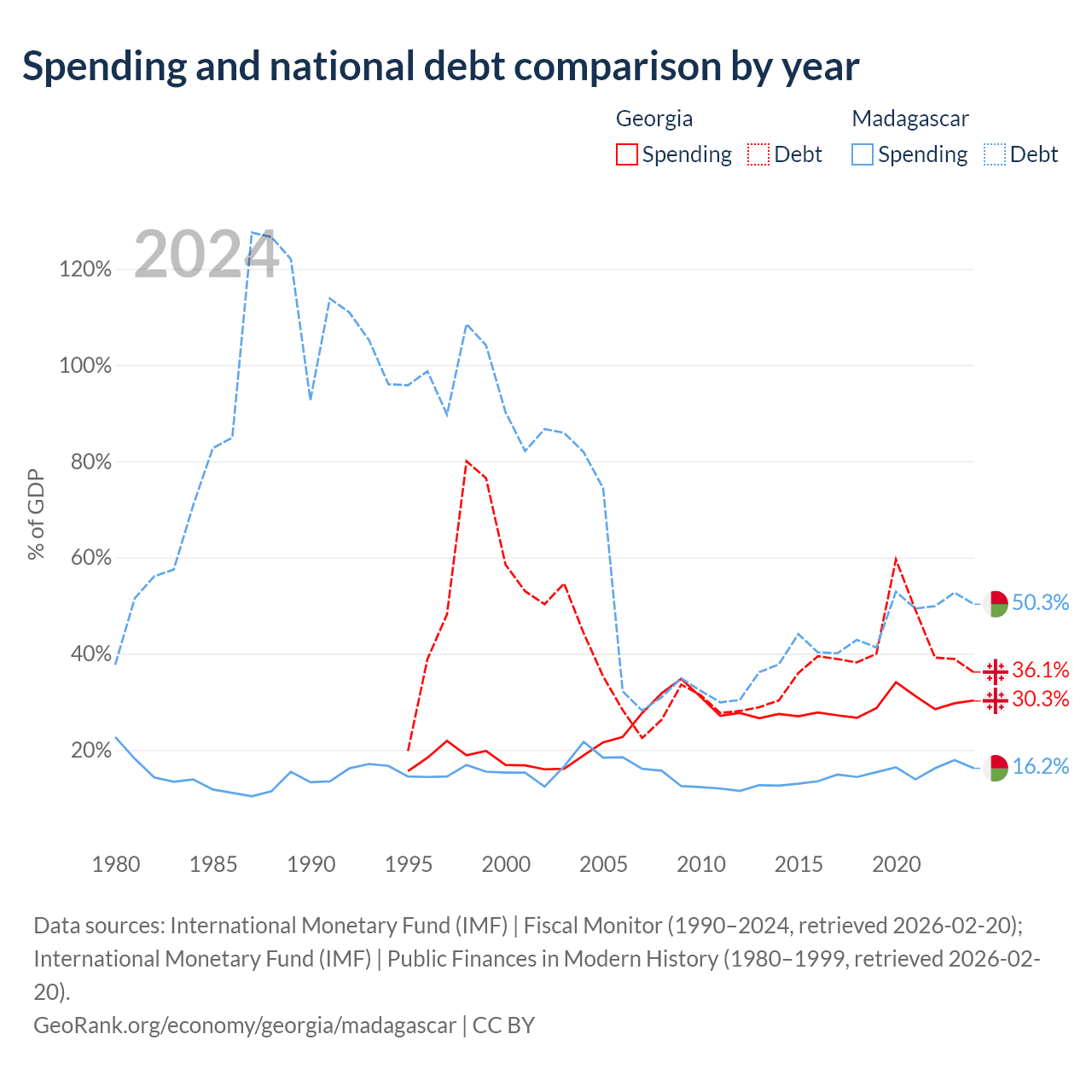 Georgia has $12.3B in government debt (36.1% of GDP), compared to $8.77B (50.3% of GDP) in Madagascar.
