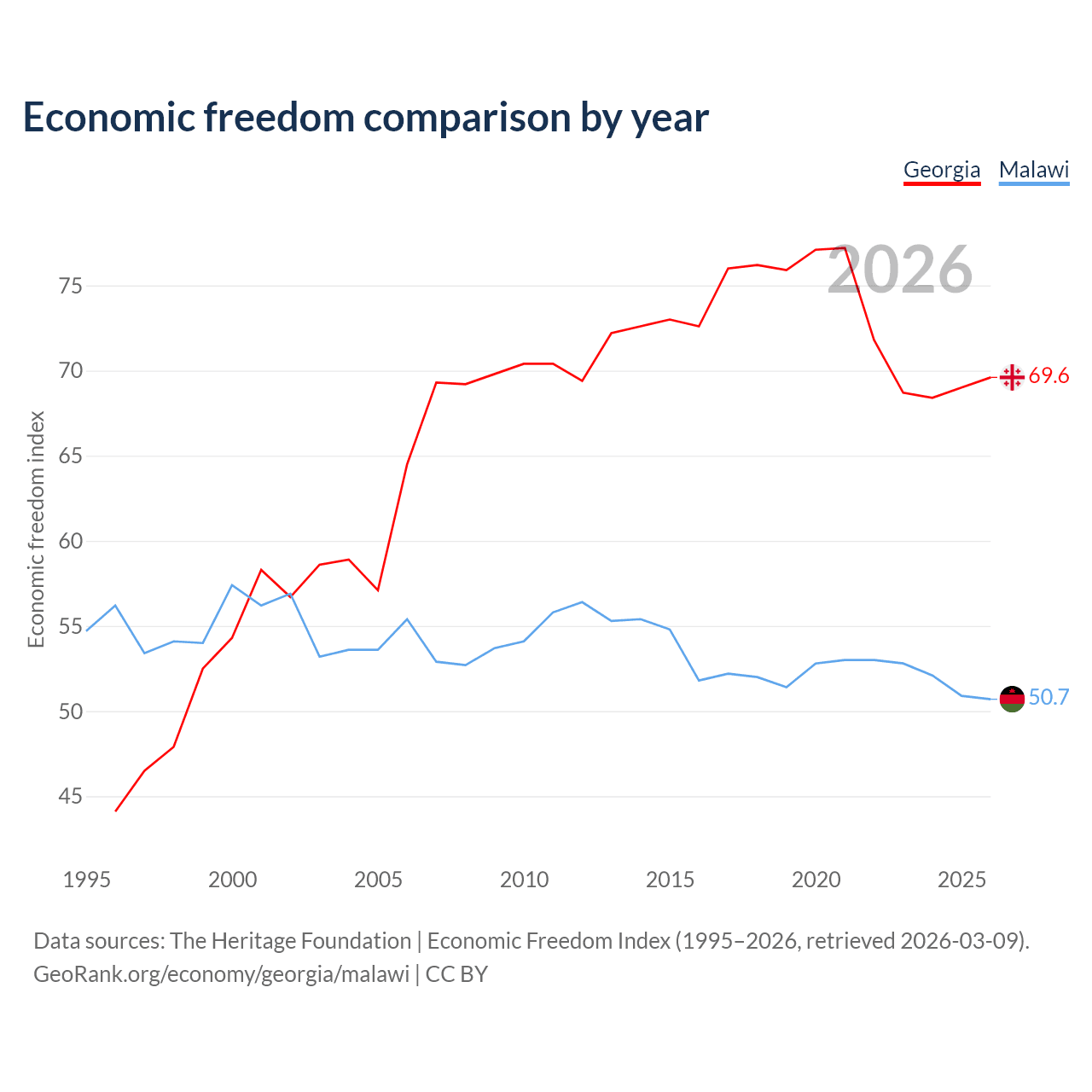 The Economic Freedom Index for Georgia is 69.6, ranking 41/197, compared to 50.7 for Malawi, ranking 159/197. The chart above displays a comparison of annual changes in economic freedom indexes.
