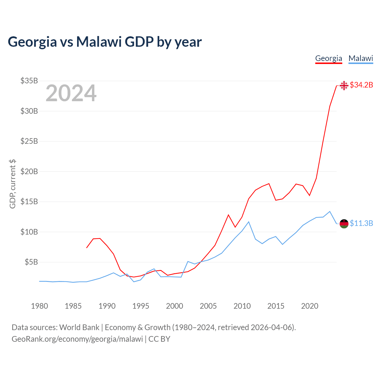 Georgia has a GDP of $34.2B compared to $11.3B for Malawi, ranking 107/197 and 151/197 by economy size, respectively.