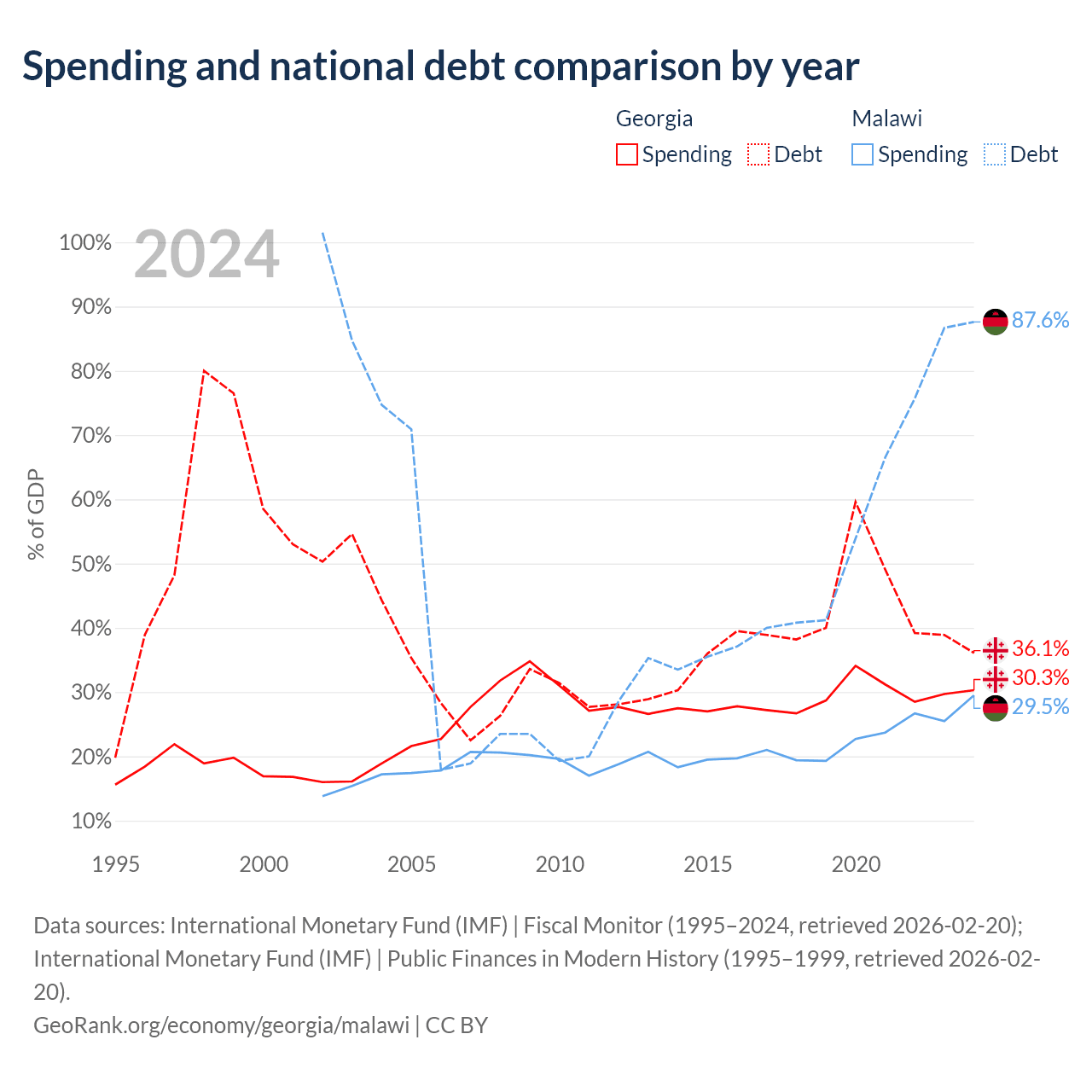 Georgia has $12.3B in government debt (36.1% of GDP), compared to $9.91B (87.6% of GDP) in Malawi.