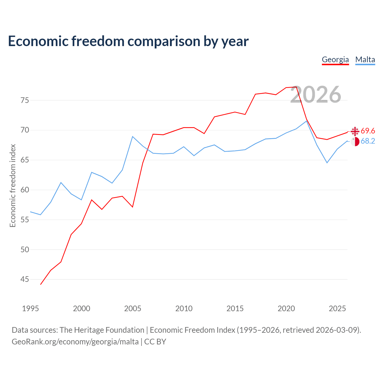 The Economic Freedom Index for Georgia is 69.6, ranking 41/197, compared to 68.2 for Malta, ranking 49/197. The chart above displays a comparison of annual changes in economic freedom indexes.