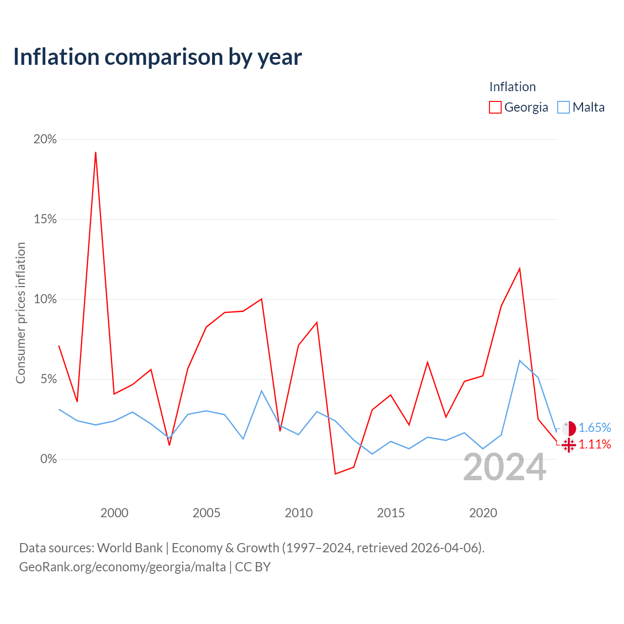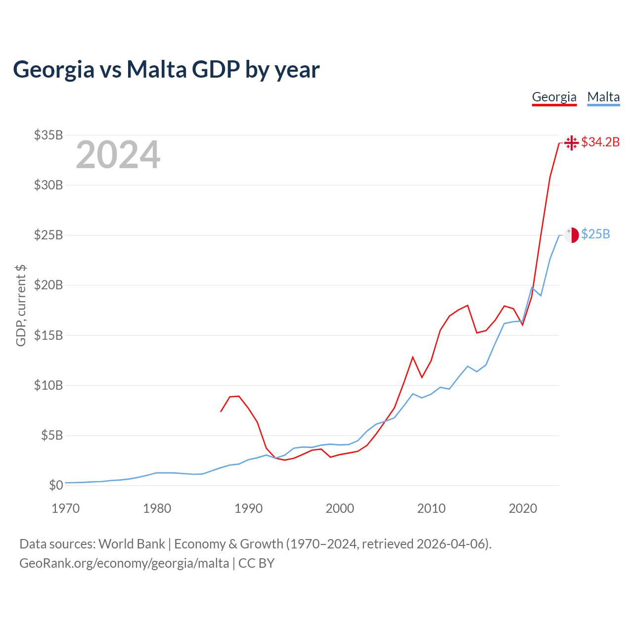 Georgia has a GDP of $34.2B compared to $25B for Malta, ranking 107/197 and 119/197 by economy size, respectively.