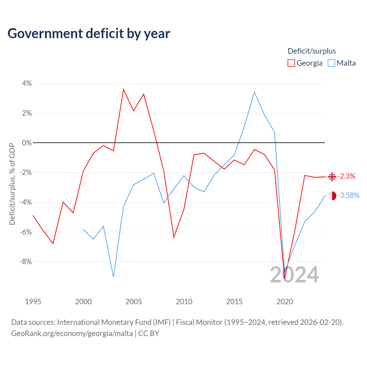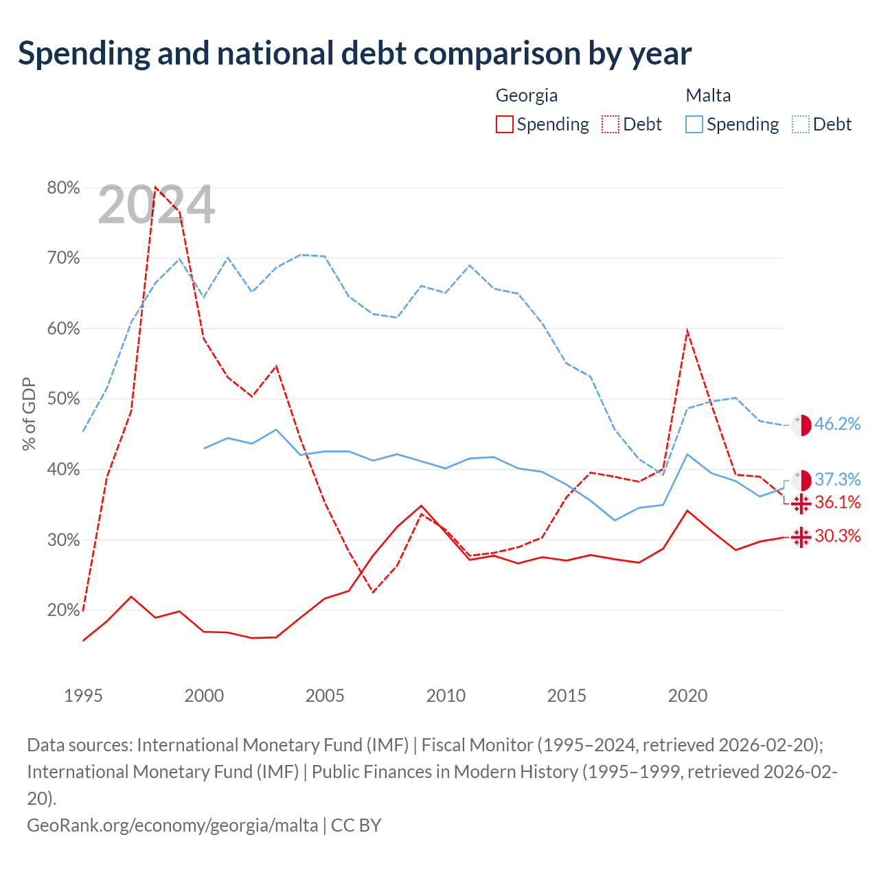 Georgia has $12.3B in government debt (36.1% of GDP), compared to $11.5B (46.2% of GDP) in Malta.