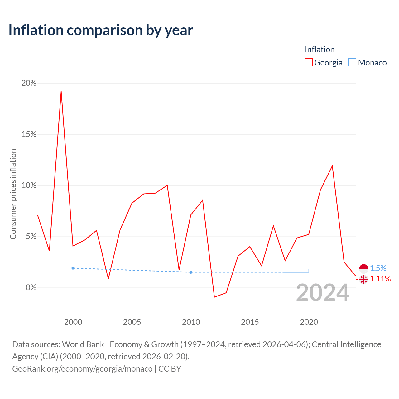 Over the past 21 years, Georgia has recorded an average annual inflation rate of 4.82%, compared with 1.58% in Monaco. In 2020, inflation was 1.11% in Georgia and 1.5% in Monaco.