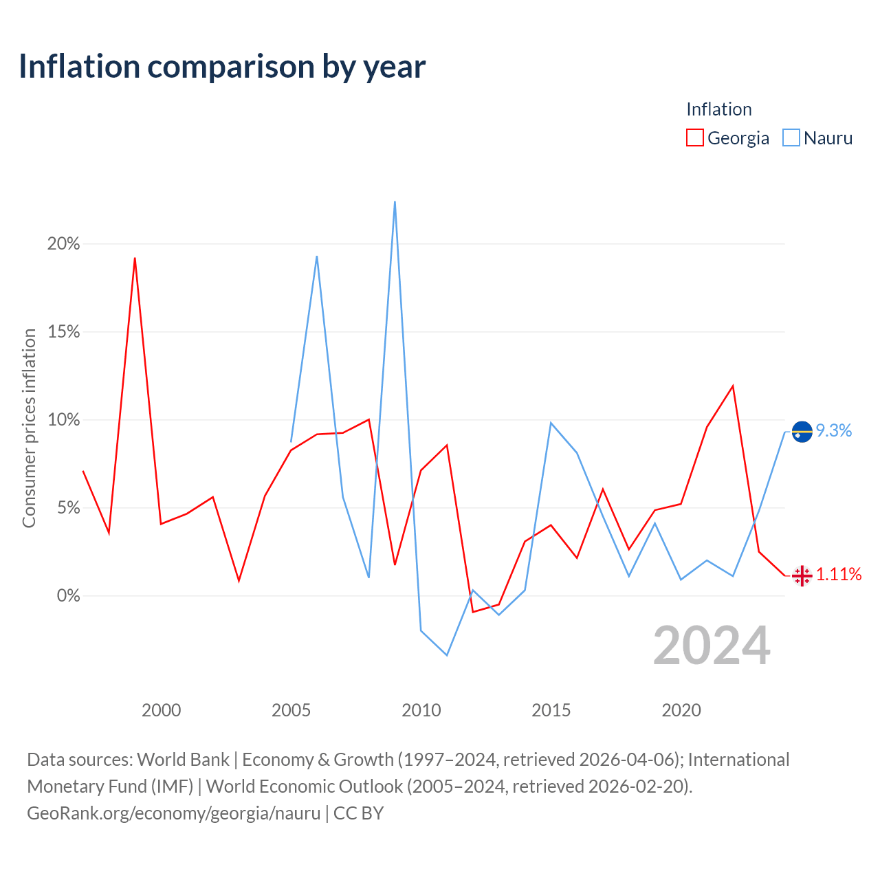 Over the past 20 years, Georgia has recorded an average annual inflation rate of 5.28%, compared with 4.84% in Nauru. In 2024, inflation was 1.11% in Georgia and 9.3% in Nauru.