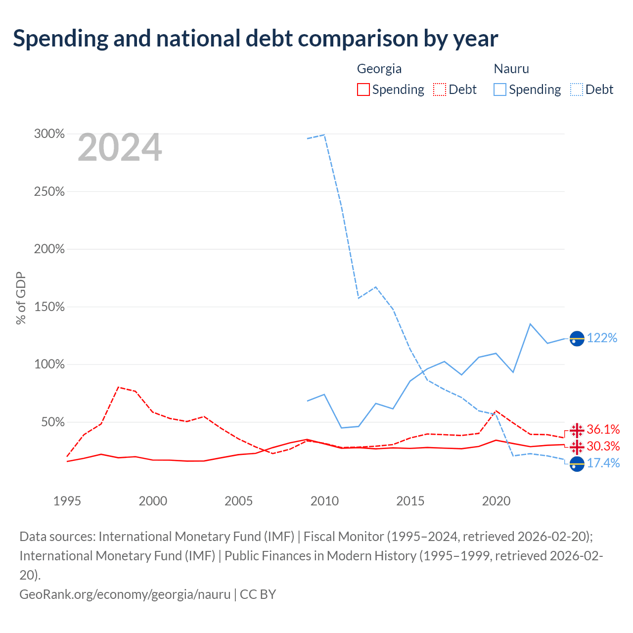 Georgia has $12.3B in government debt (36.1% of GDP), compared to $28.3M (17.4% of GDP) in Nauru.