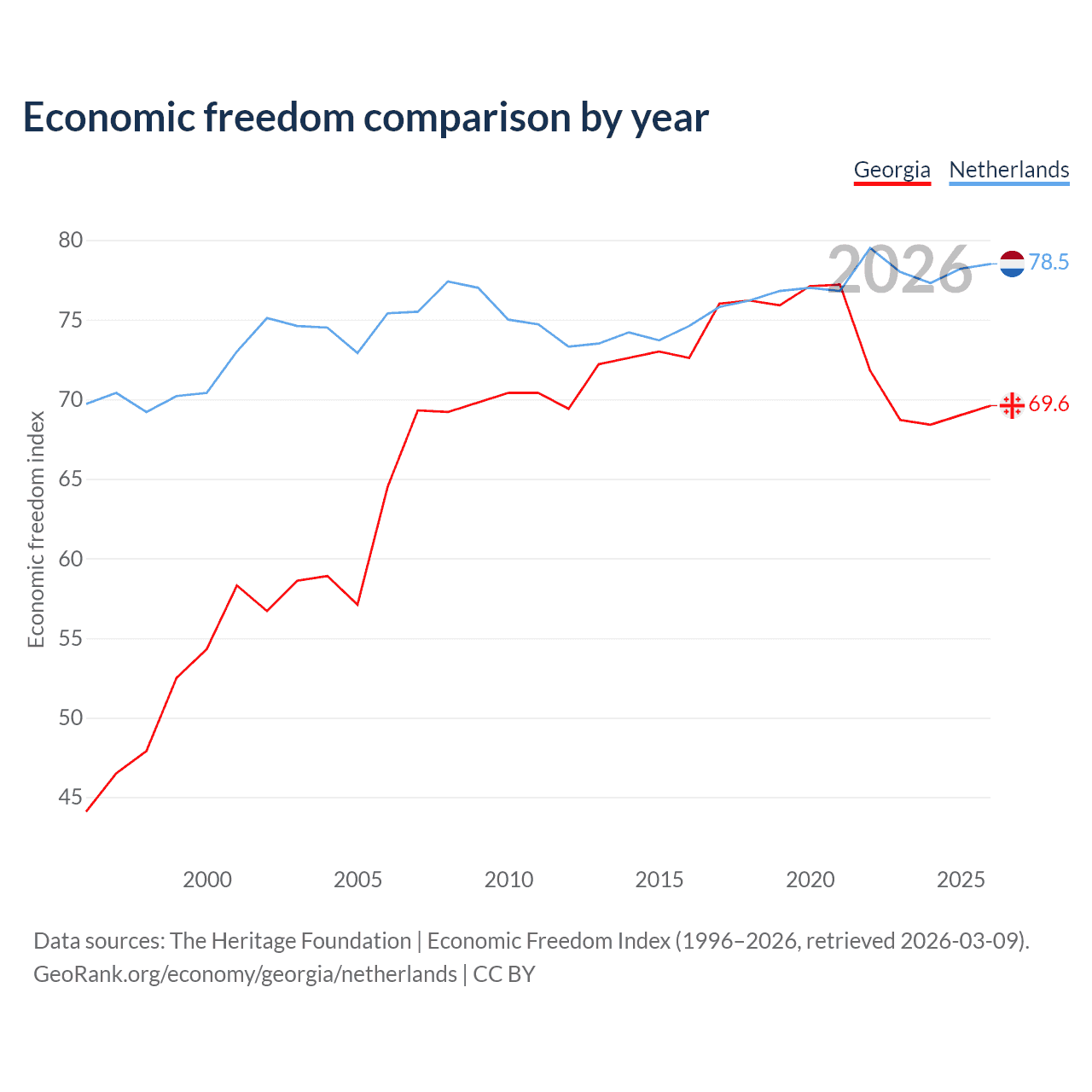 The Economic Freedom Index for Georgia is 69.6, ranking 41/197, compared to 78.5 for the Netherlands, ranking 11/197. The chart above displays a comparison of annual changes in economic freedom indexes.