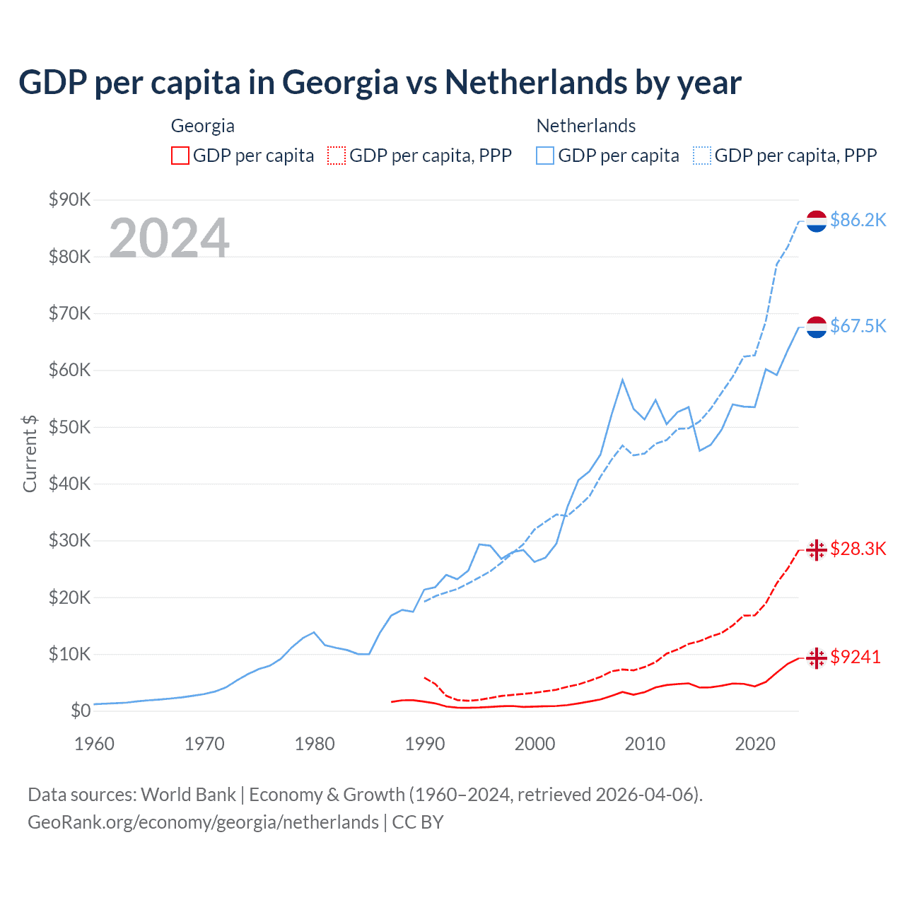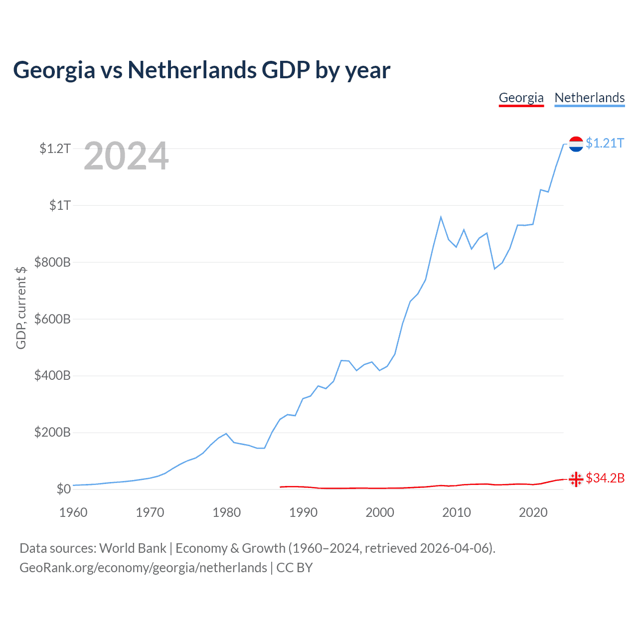 Georgia has a GDP of $34.2B compared to $1.21T for the Netherlands, ranking 107/197 and 19/197 by economy size, respectively.