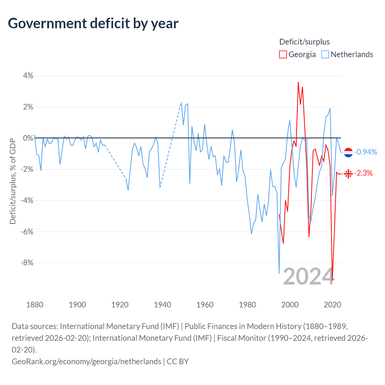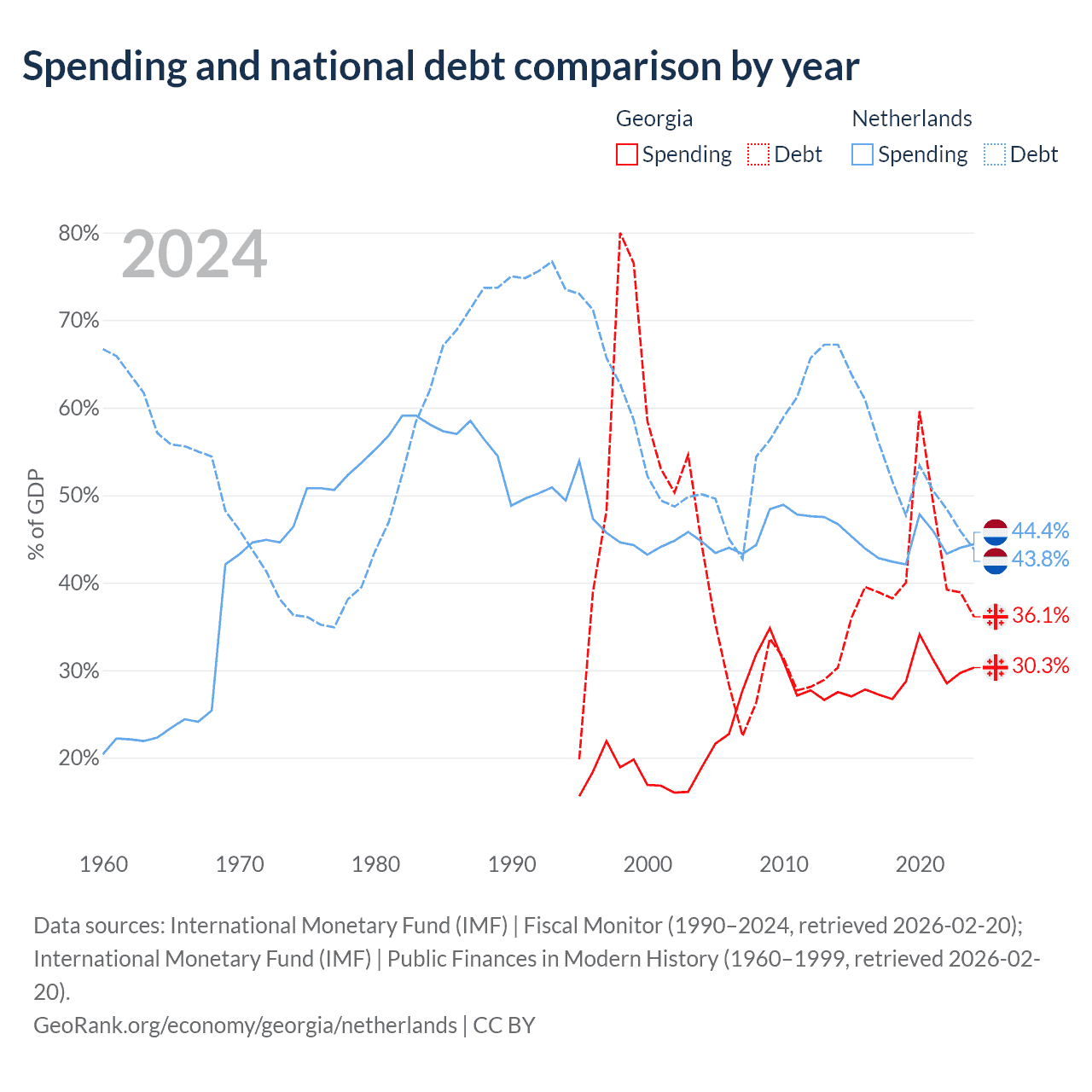 Georgia has $12.3B in government debt (36.1% of GDP), compared to $532B (43.8% of GDP) in the Netherlands.
