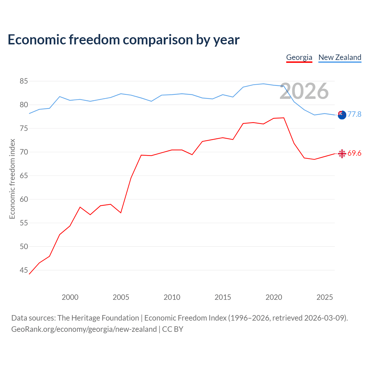 The Economic Freedom Index for Georgia is 69.6, ranking 41/197, compared to 77.8 for New Zealand, ranking 13/197. The chart above displays a comparison of annual changes in economic freedom indexes.