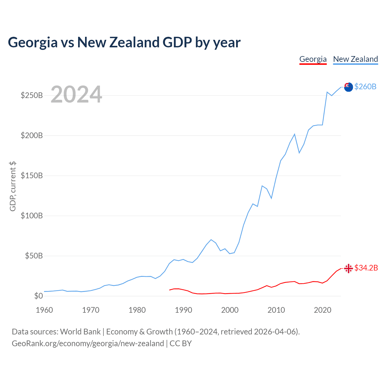 Georgia has a GDP of $34.2B compared to $260B for New Zealand, ranking 107/197 and 52/197 by economy size, respectively.