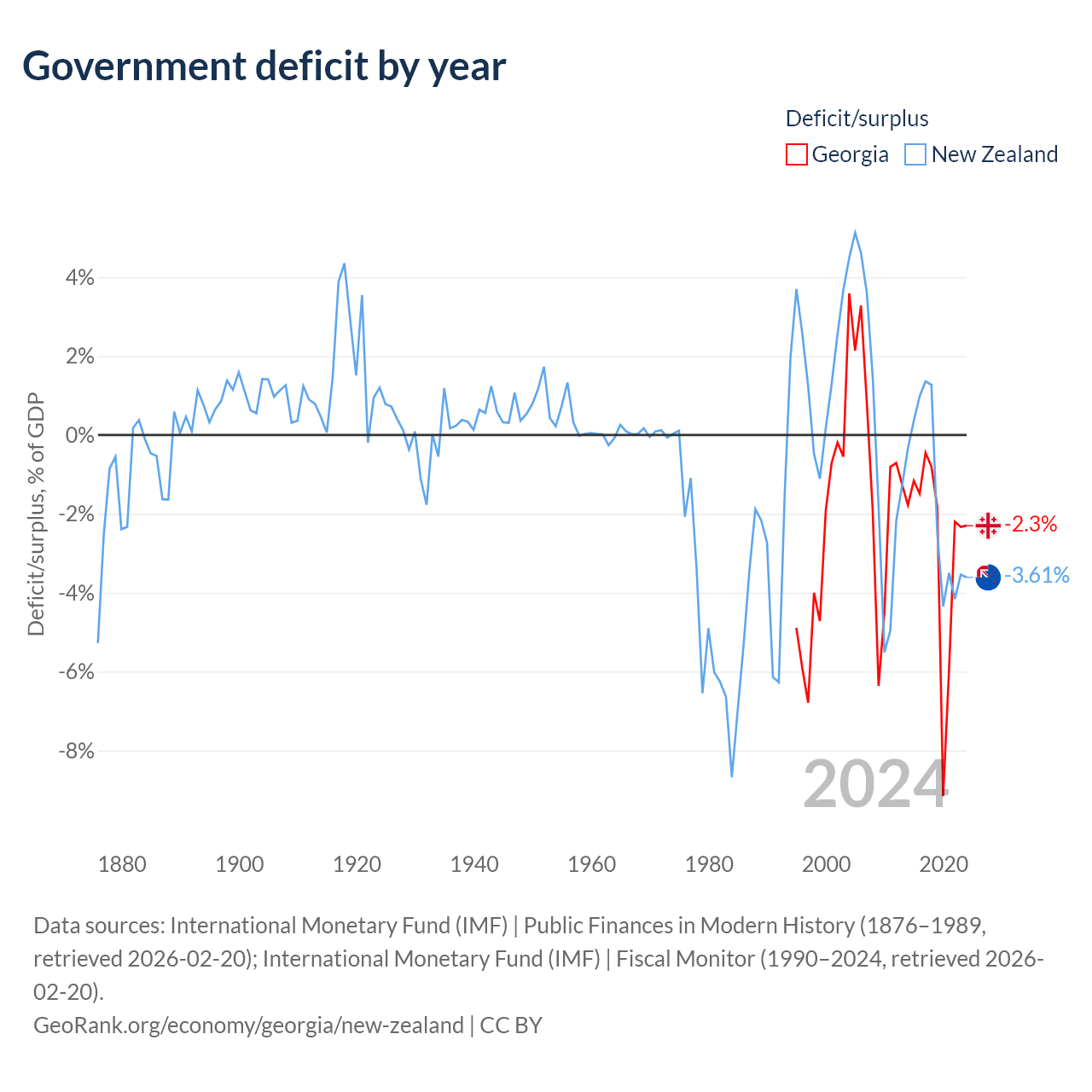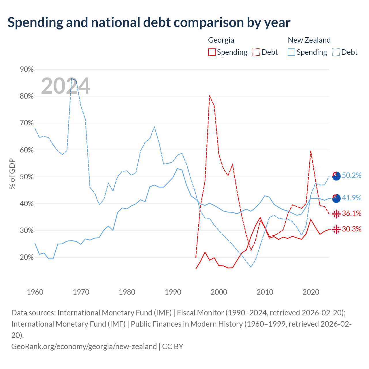 Georgia has $12.3B in government debt (36.1% of GDP), compared to $131B (50.2% of GDP) in New Zealand.