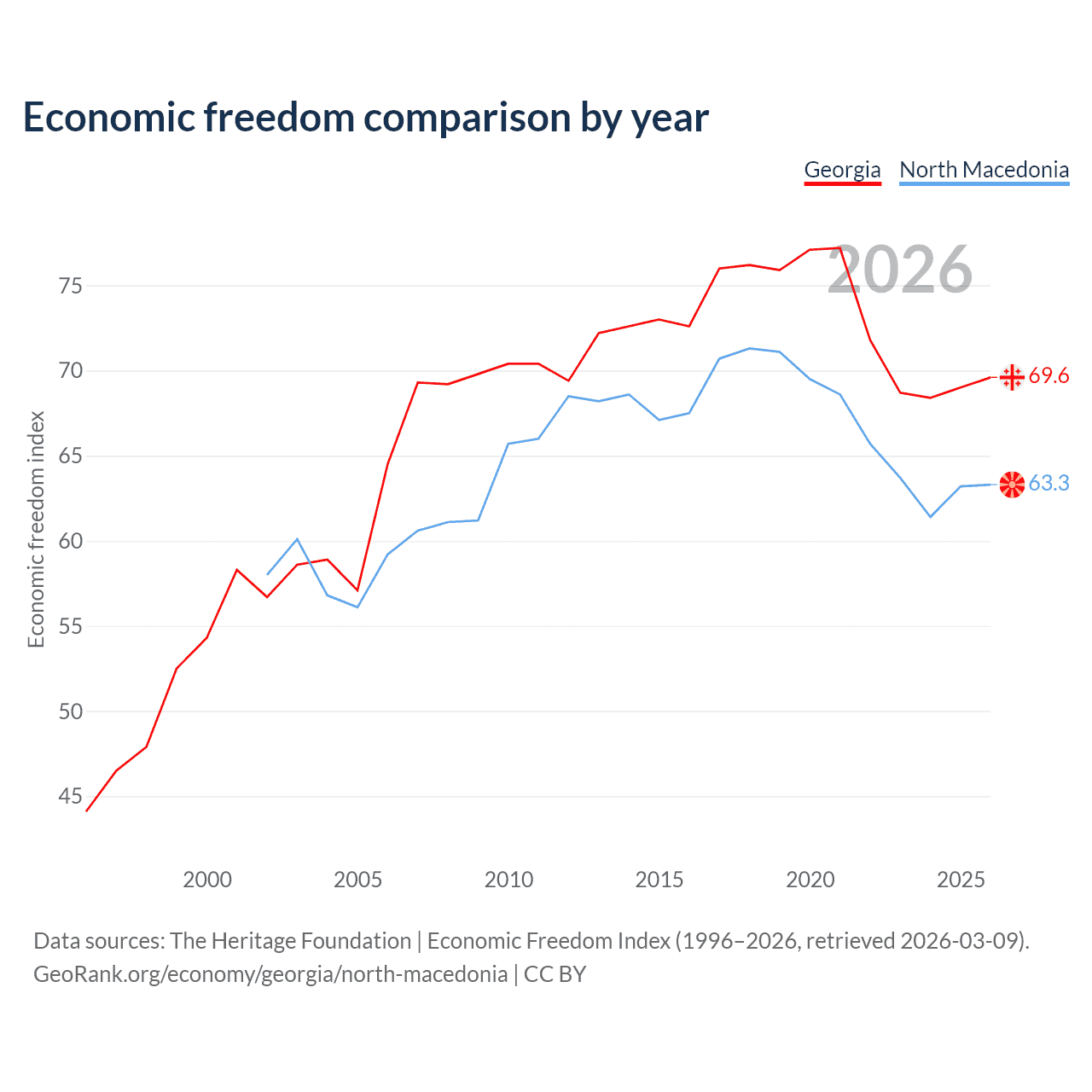 The Economic Freedom Index for Georgia is 69.6, ranking 41/197, compared to 63.3 for North Macedonia, ranking 81/197. The chart above displays a comparison of annual changes in economic freedom indexes.