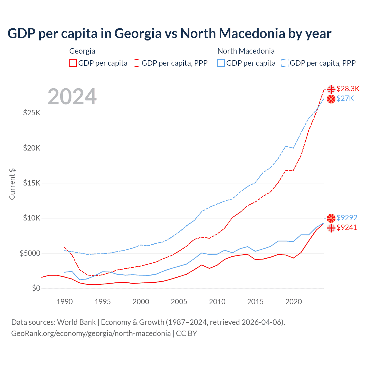 GDP per capita in Georgia vs North Macedonia by year