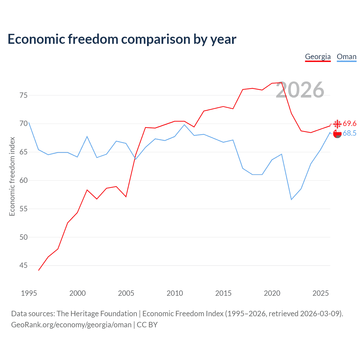 The Economic Freedom Index for Georgia is 69.6, ranking 41/197, compared to 68.5 for Oman, ranking 45/197. The chart above displays a comparison of annual changes in economic freedom indexes.