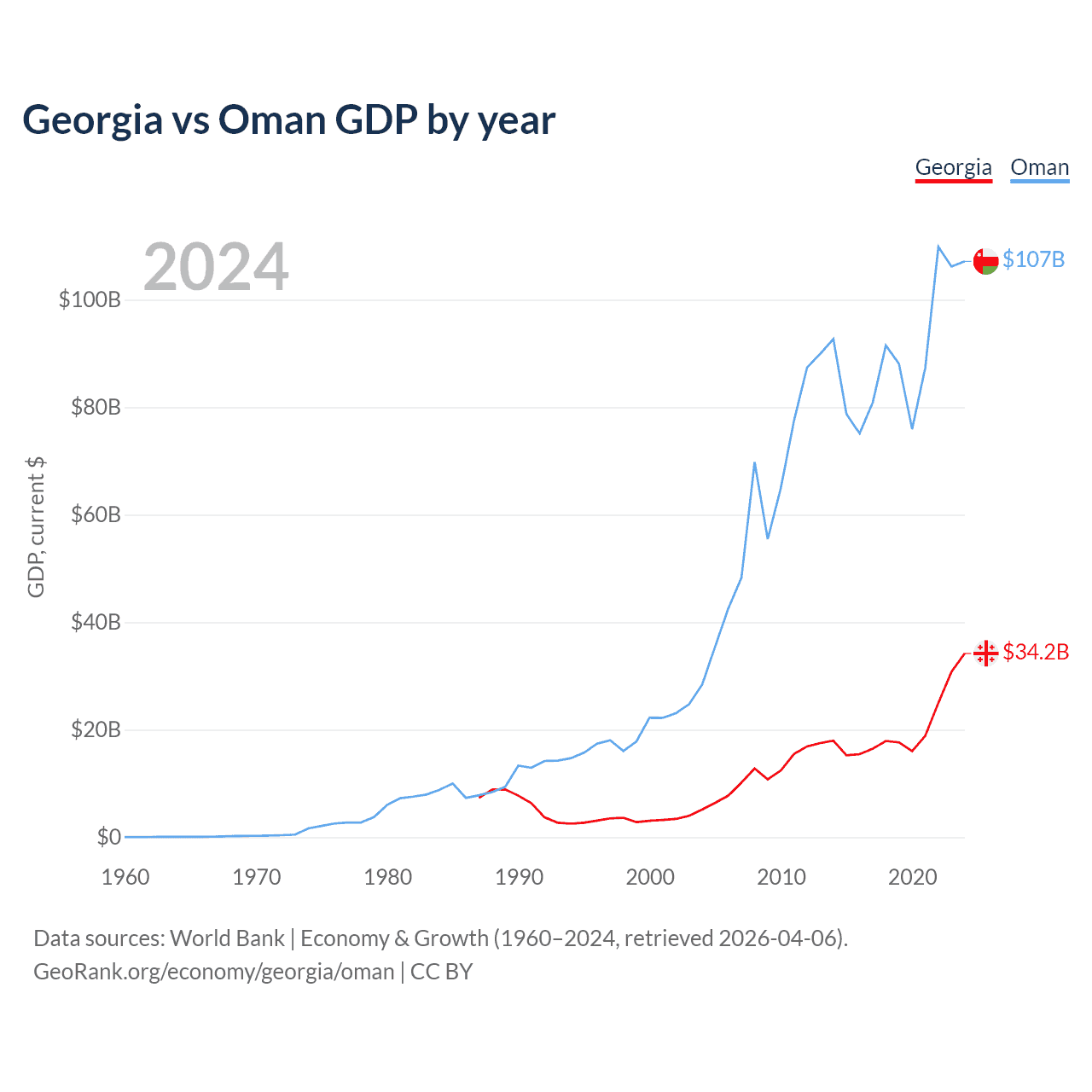 Georgia has a GDP of $34.2B compared to $107B for Oman, ranking 107/197 and 70/197 by economy size, respectively.