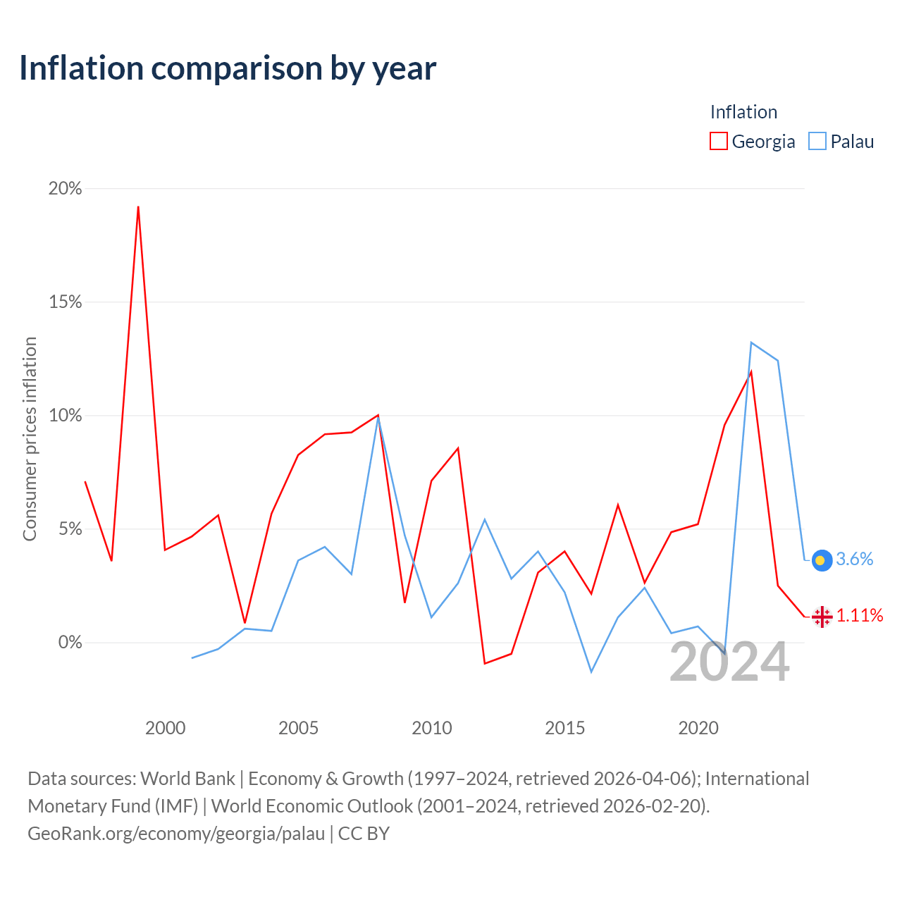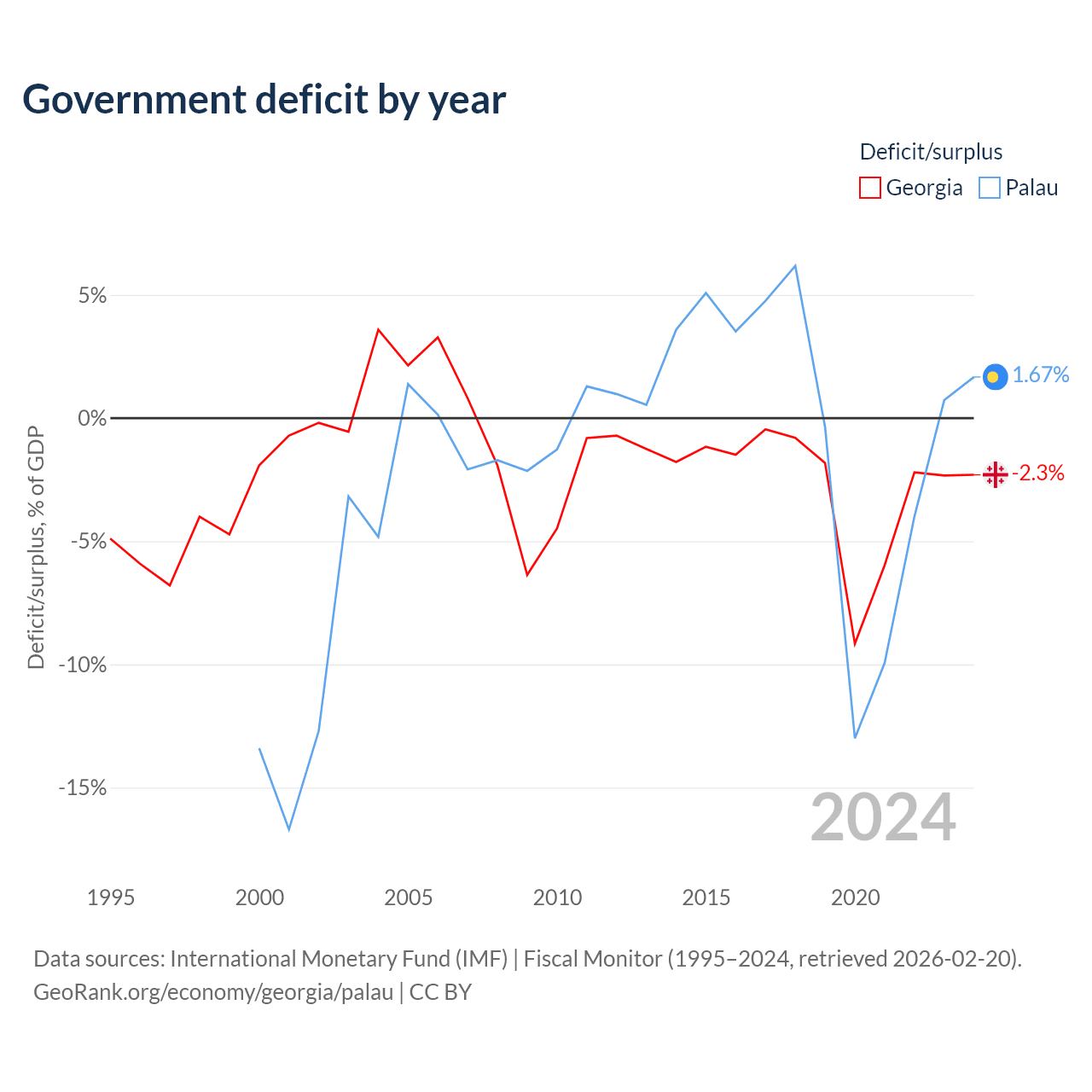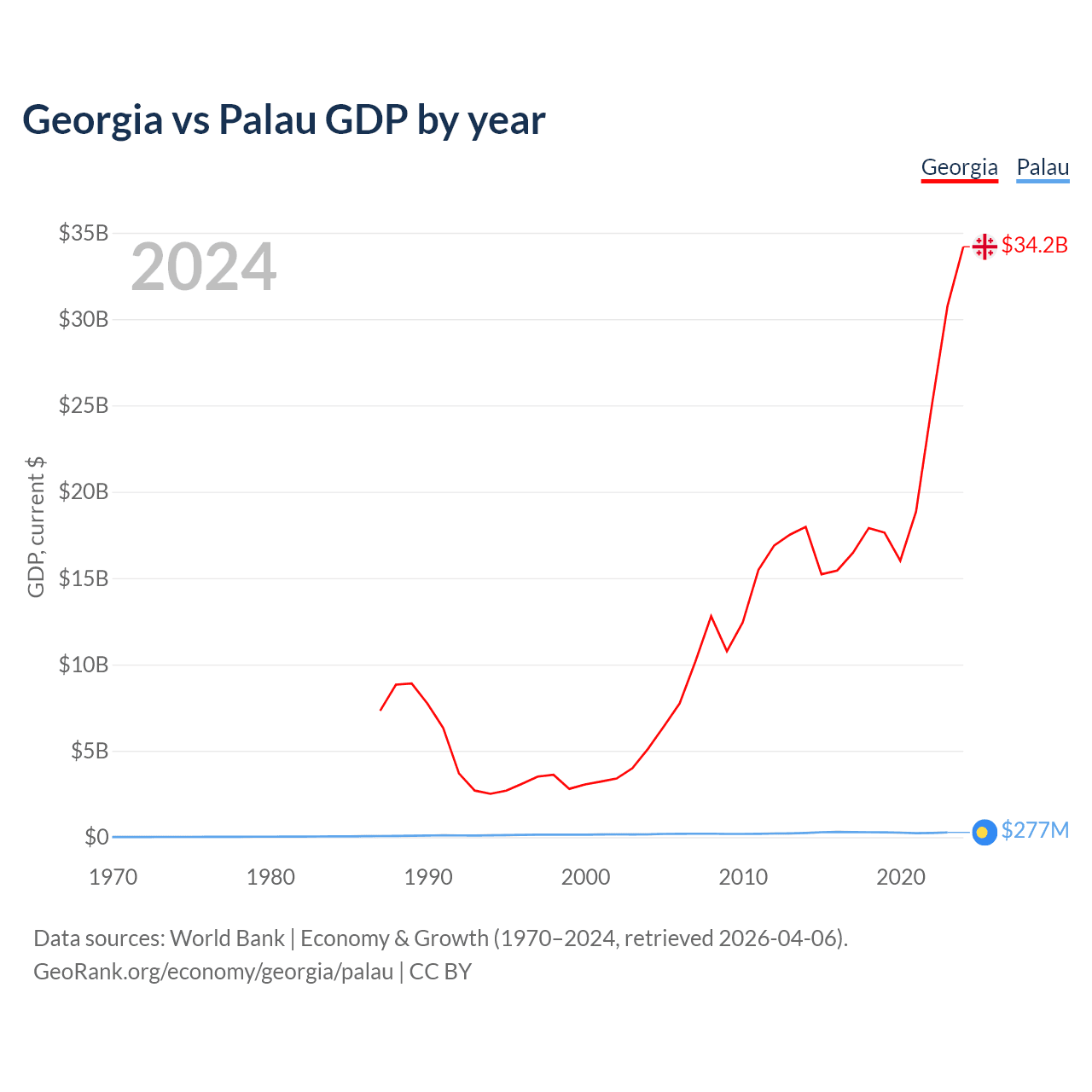 Georgia has a GDP of $34.2B compared to $277M for Palau, ranking 107/197 and 194/197 by economy size, respectively.