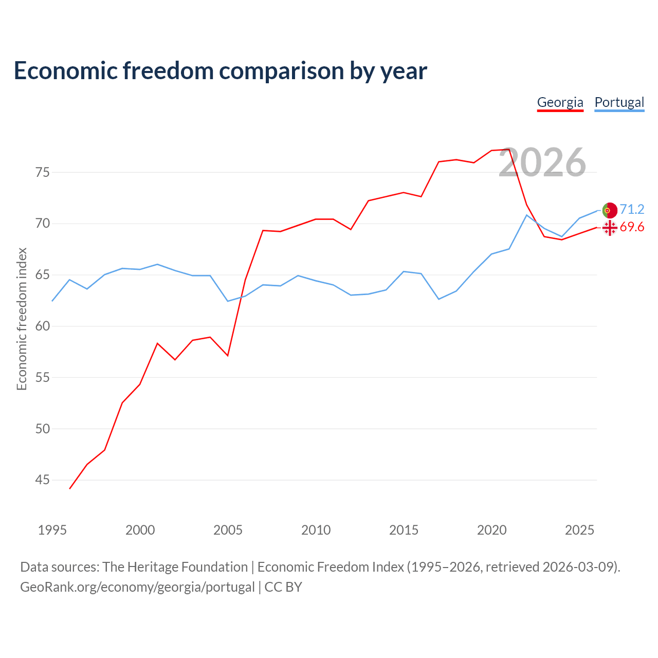 The Economic Freedom Index for Georgia is 69.6, ranking 41/197, compared to 71.2 for Portugal, ranking 33/197. The chart above displays a comparison of annual changes in economic freedom indexes.