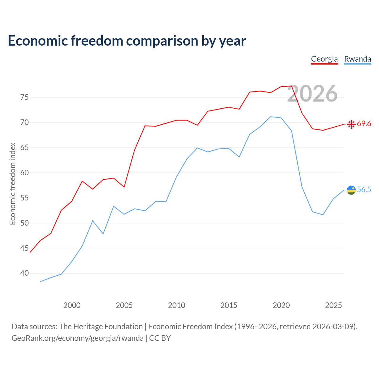 The Economic Freedom Index for Georgia is 69.6, ranking 41/197, compared to 56.5 for Rwanda, ranking 121/197. The chart above displays a comparison of annual changes in economic freedom indexes.