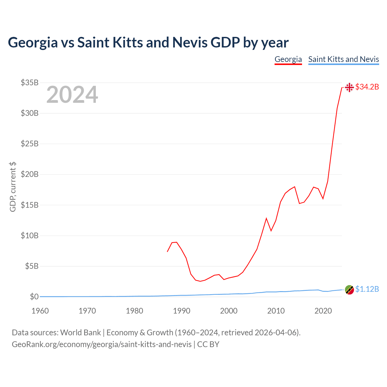 Georgia has a GDP of $34.2B compared to $1.12B for Saint Kitts and Nevis, ranking 107/197 and 187/197 by economy size, respectively.