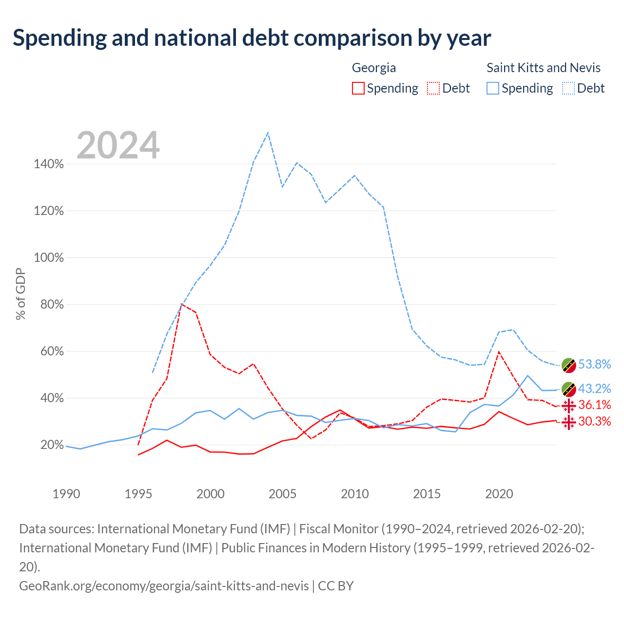 Georgia has $12.3B in government debt (36.1% of GDP), compared to $604M (53.8% of GDP) in Saint Kitts and Nevis.