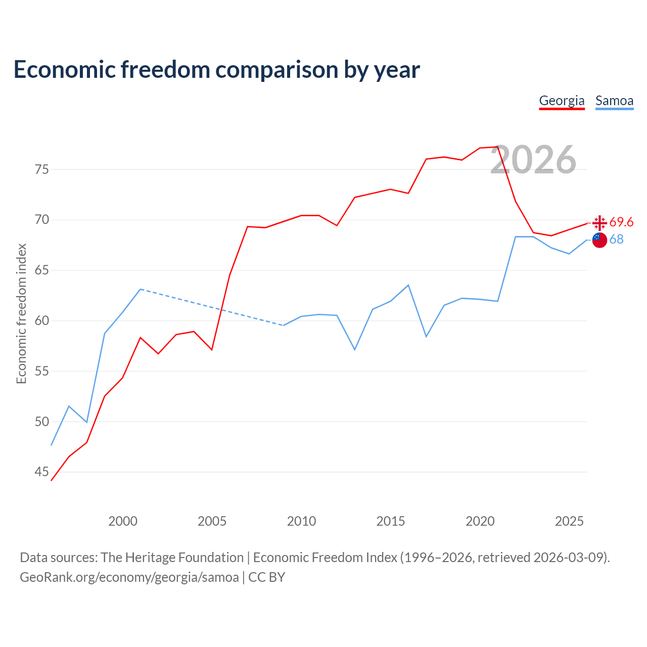 The Economic Freedom Index for Georgia is 69.6, ranking 41/197, compared to 68 for Samoa, ranking 52/197. The chart above displays a comparison of annual changes in economic freedom indexes.
