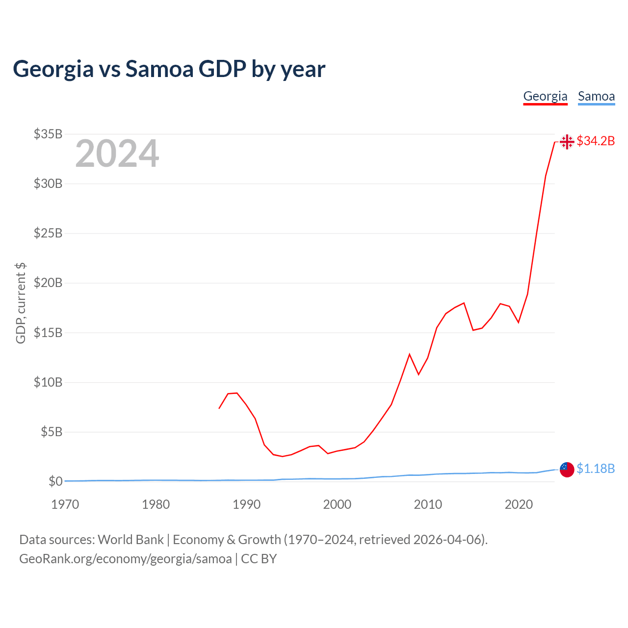 Georgia has a GDP of $34.2B compared to $1.18B for Samoa, ranking 107/197 and 185/197 by economy size, respectively.