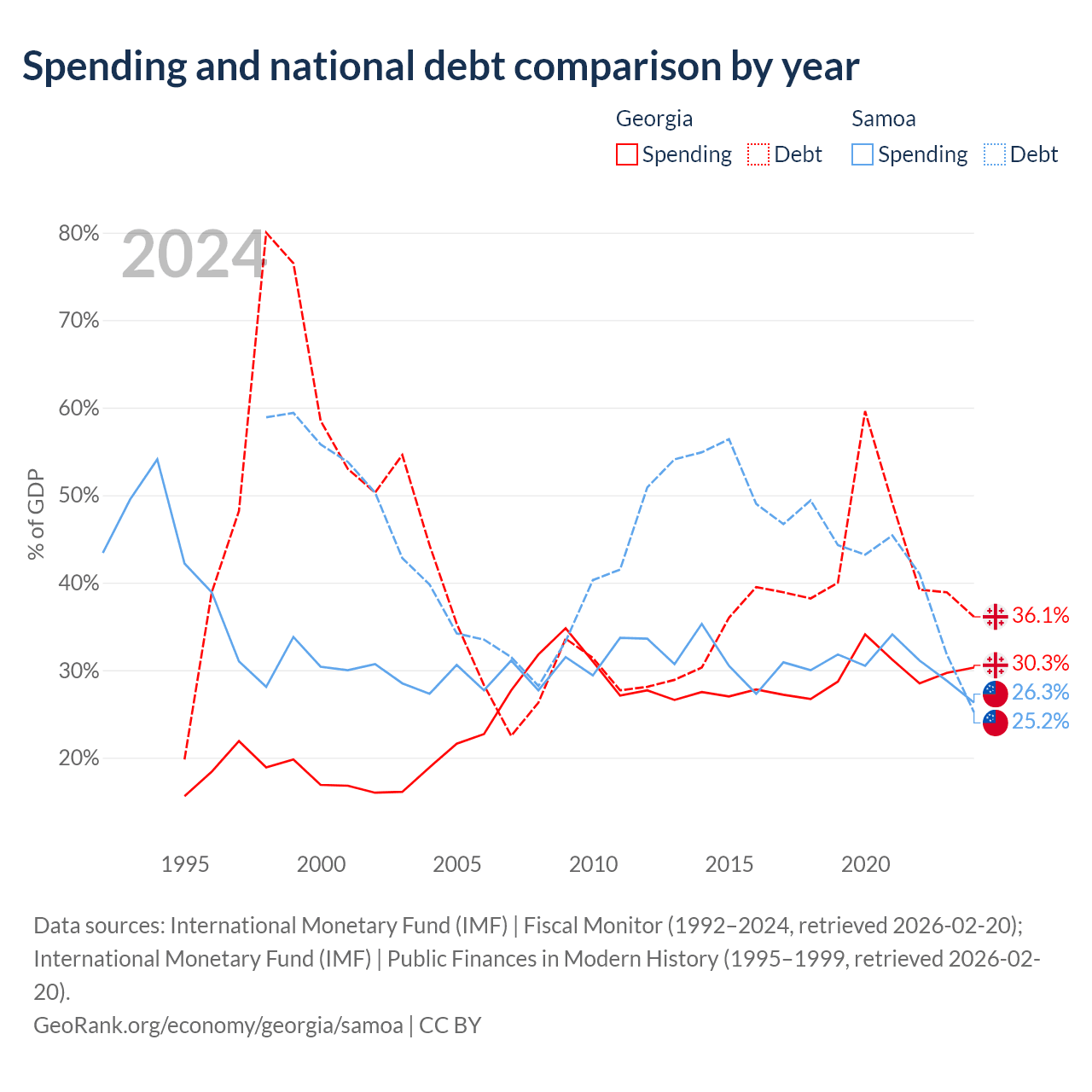 Georgia has $12.3B in government debt (36.1% of GDP), compared to $296M (25.2% of GDP) in Samoa.
