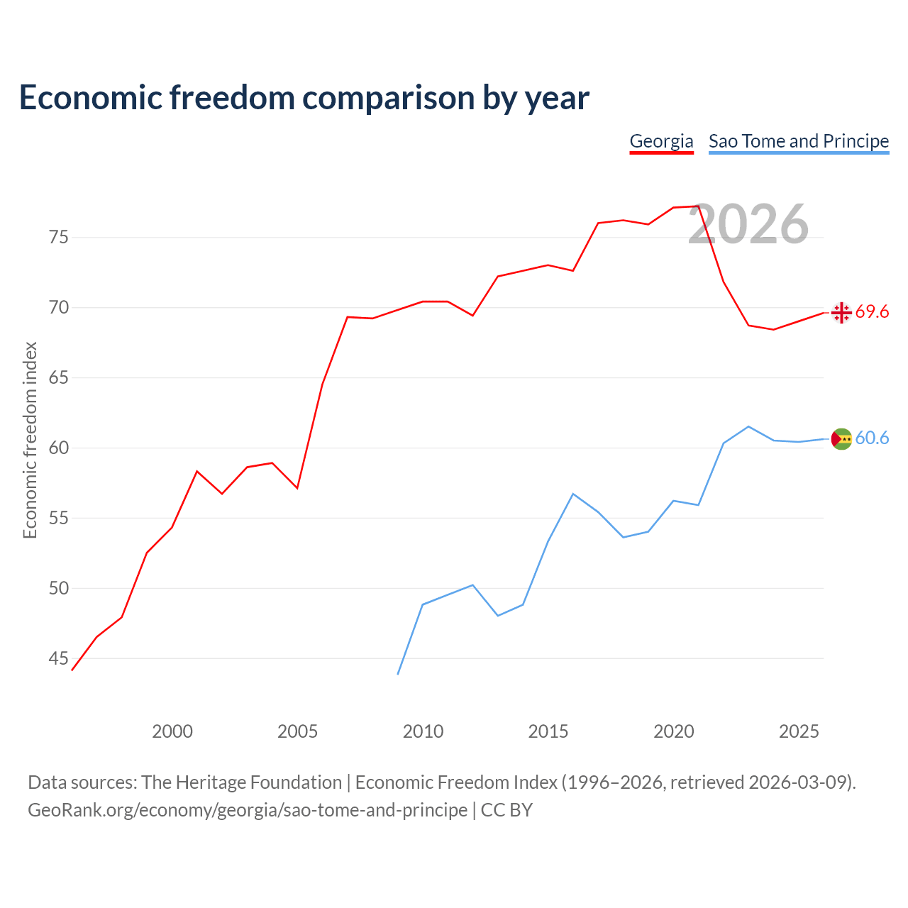 The Economic Freedom Index for Georgia is 69.6, ranking 41/197, compared to 60.6 for Sao Tome and Principe, ranking 93/197. The chart above displays a comparison of annual changes in economic freedom indexes.