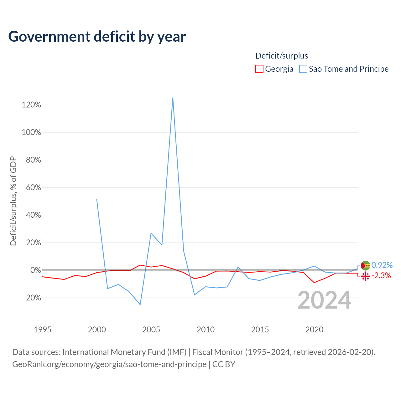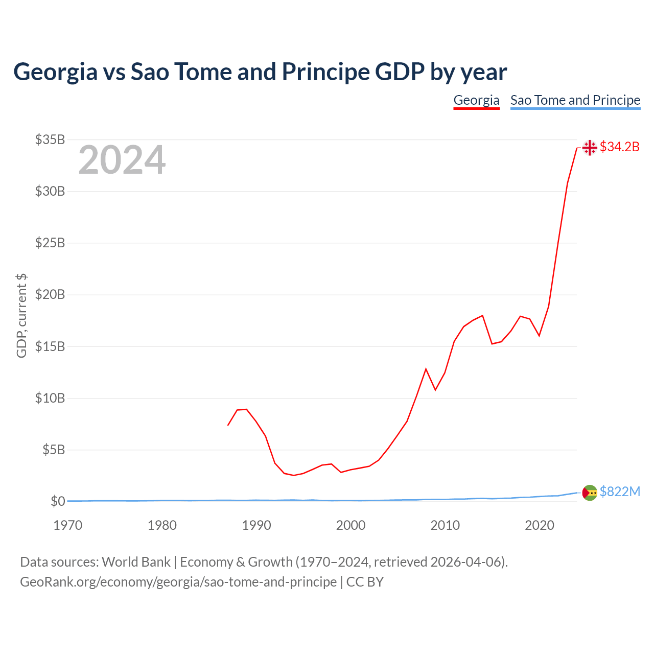 Georgia has a GDP of $34.2B compared to $822M for Sao Tome and Principe, ranking 107/197 and 189/197 by economy size, respectively.