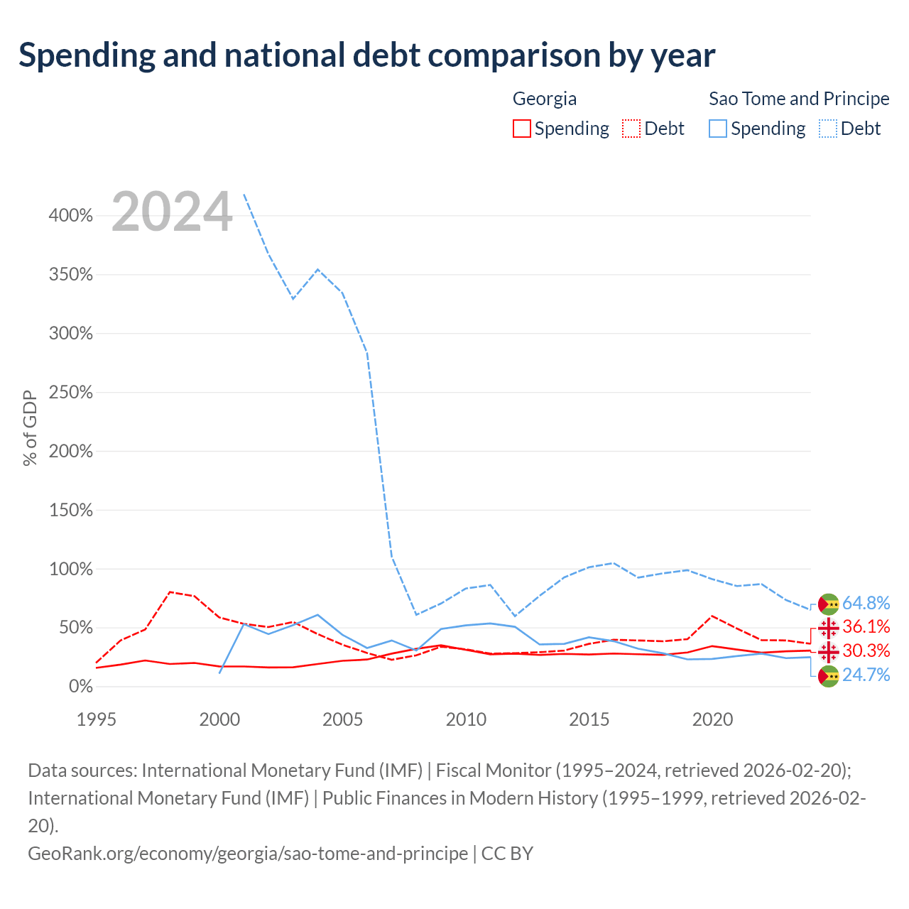 Georgia has $12.3B in government debt (36.1% of GDP), compared to $533M (64.8% of GDP) in Sao Tome and Principe.