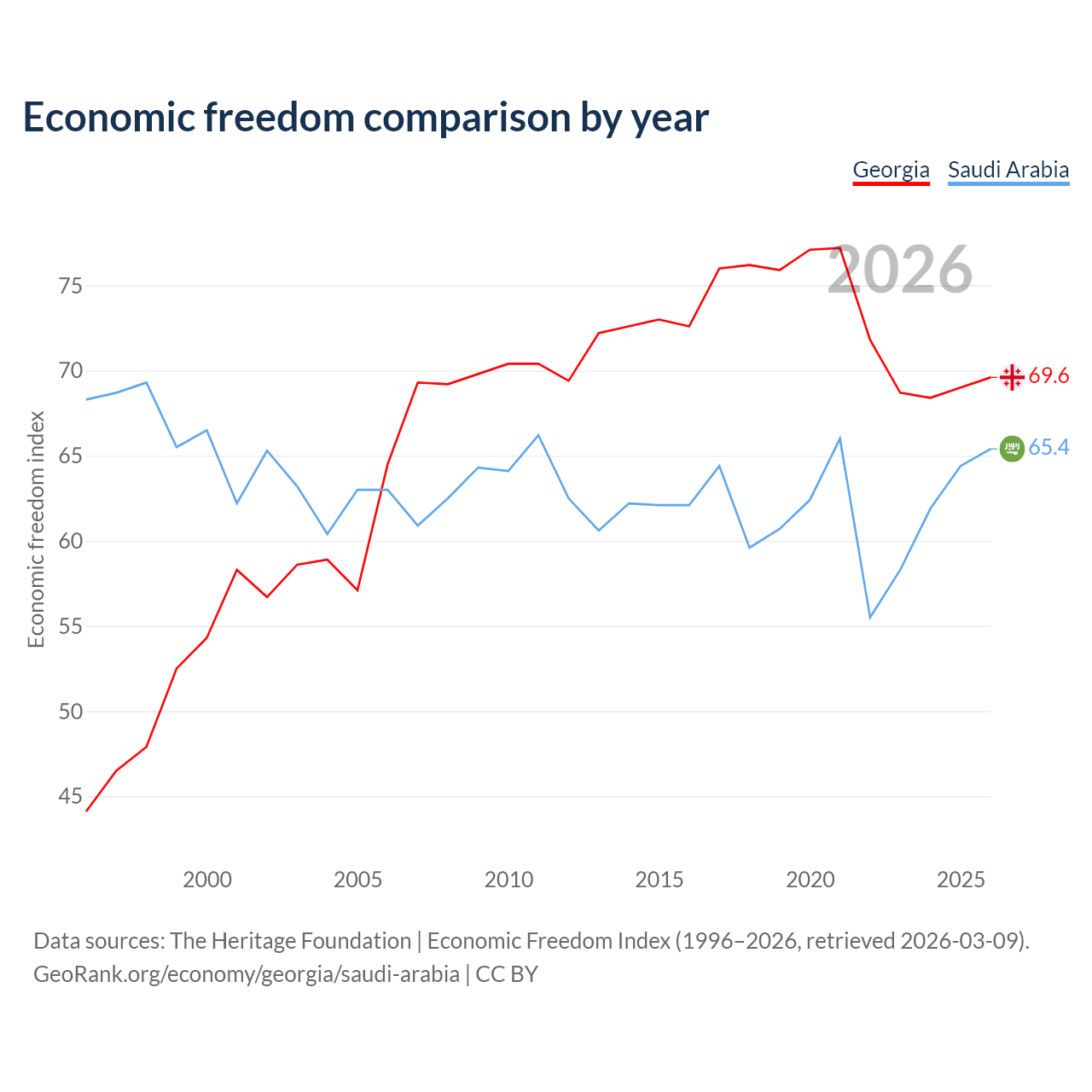 The Economic Freedom Index for Georgia is 69.6, ranking 41/197, compared to 65.4 for Saudi Arabia, ranking 65/197. The chart above displays a comparison of annual changes in economic freedom indexes.