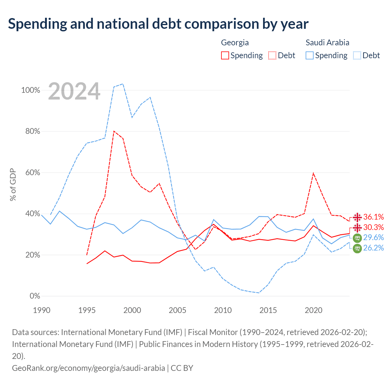 Georgia has $12.3B in government debt (36.1% of GDP), compared to $324B (26.2% of GDP) in Saudi Arabia.
